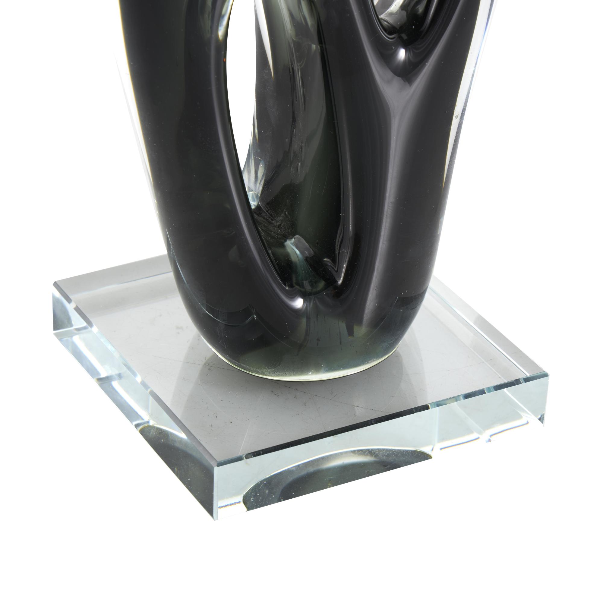 •This contemporary accent statue is constructed by carefully shaping and polishing the glass, along with precise application of the accents to create an exquisite finish and the attachment of its glass base