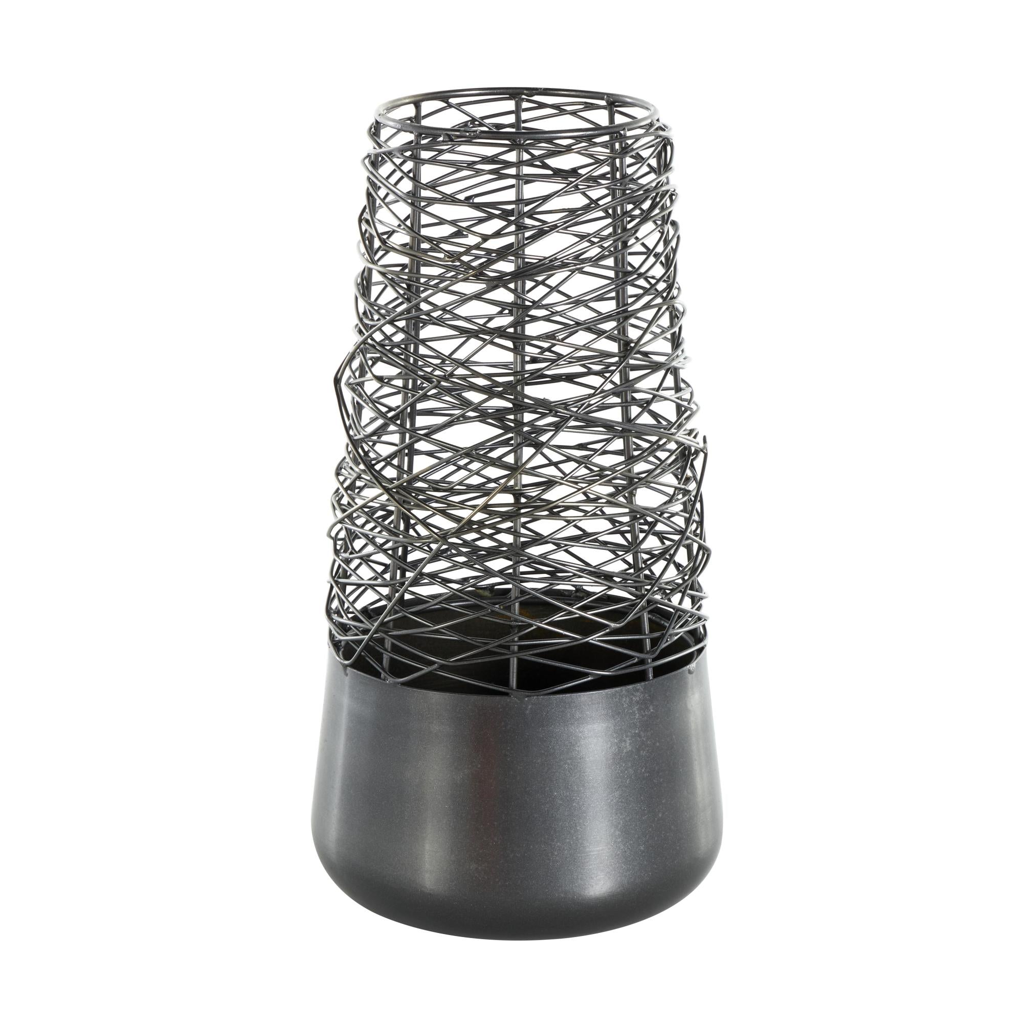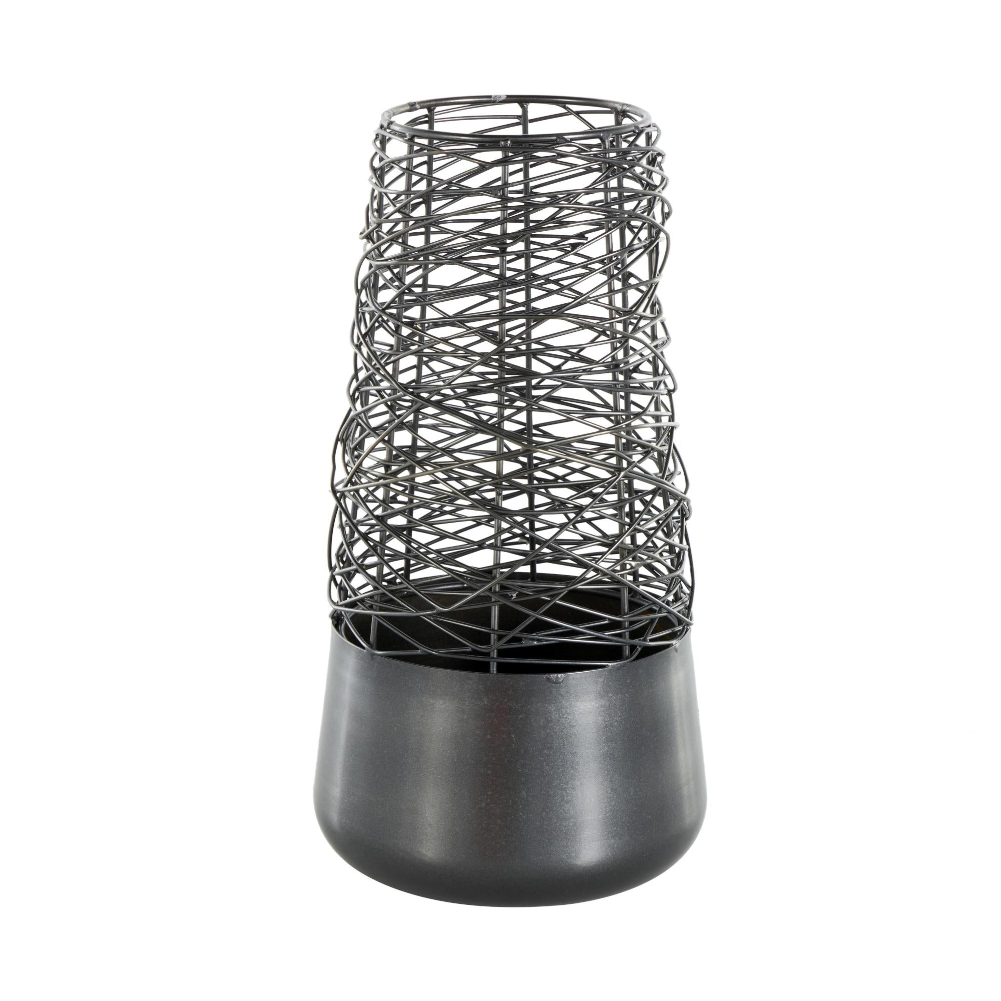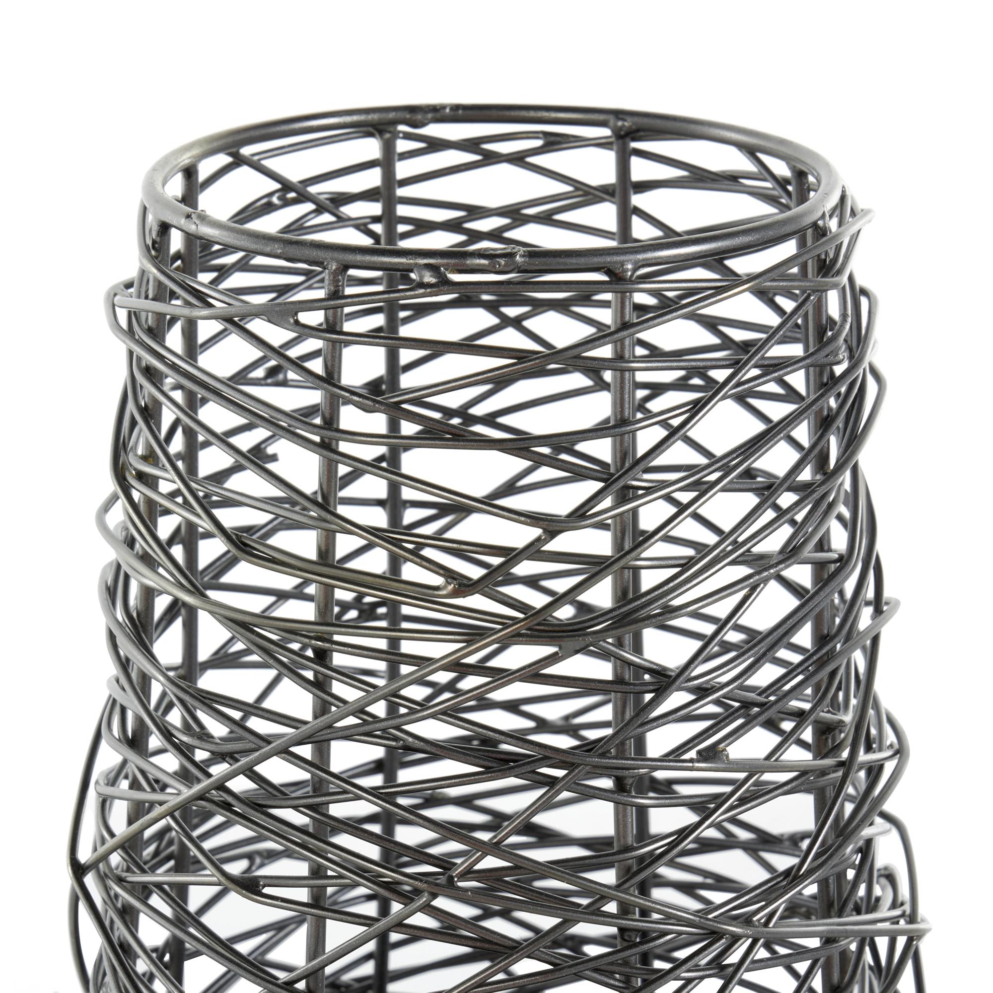 •The metal vase features an abstract design with an intertwined wire pattern atop a solid base, creating an interesting visual contrast and adding depth to the piece