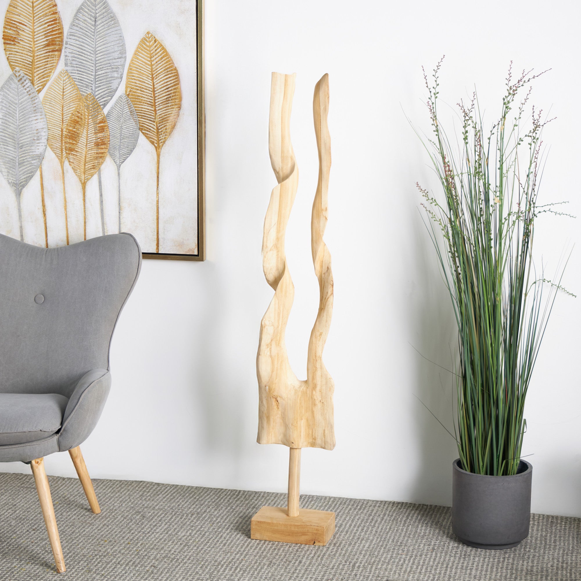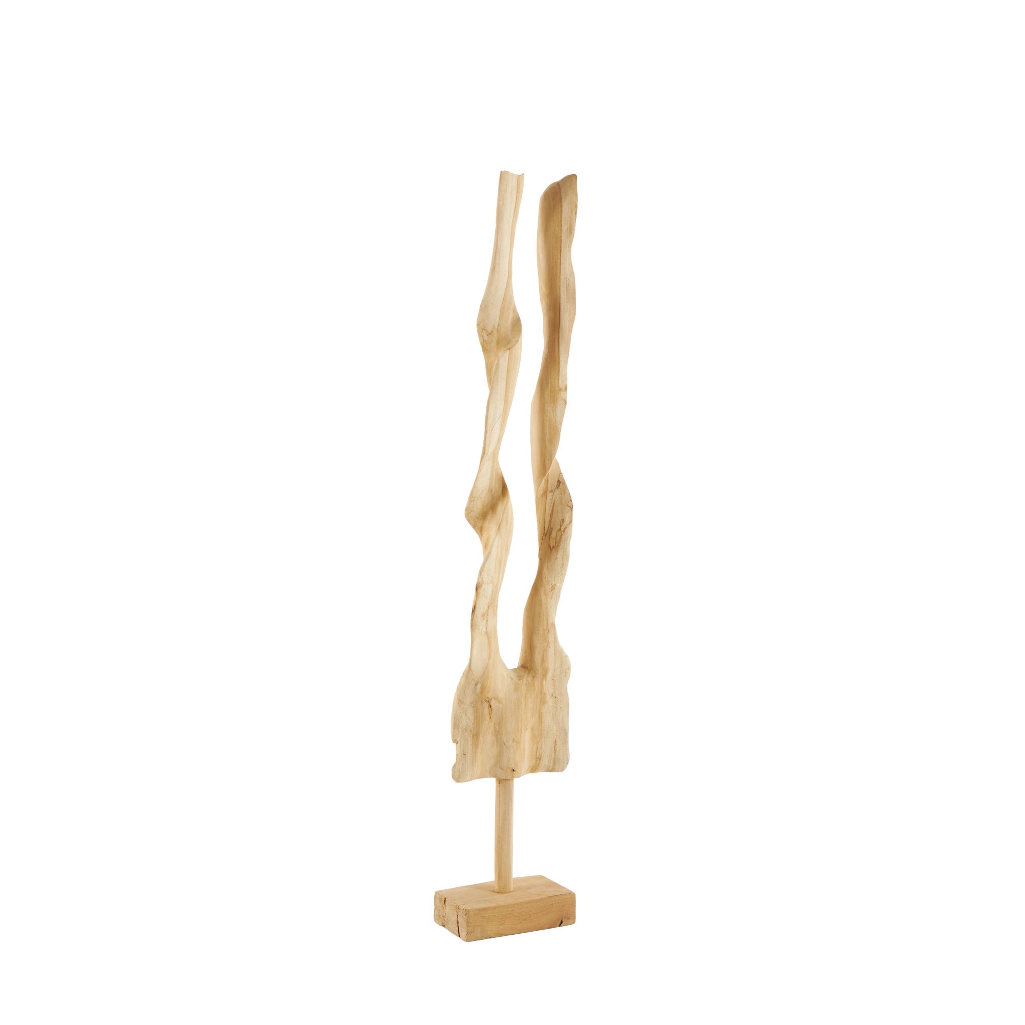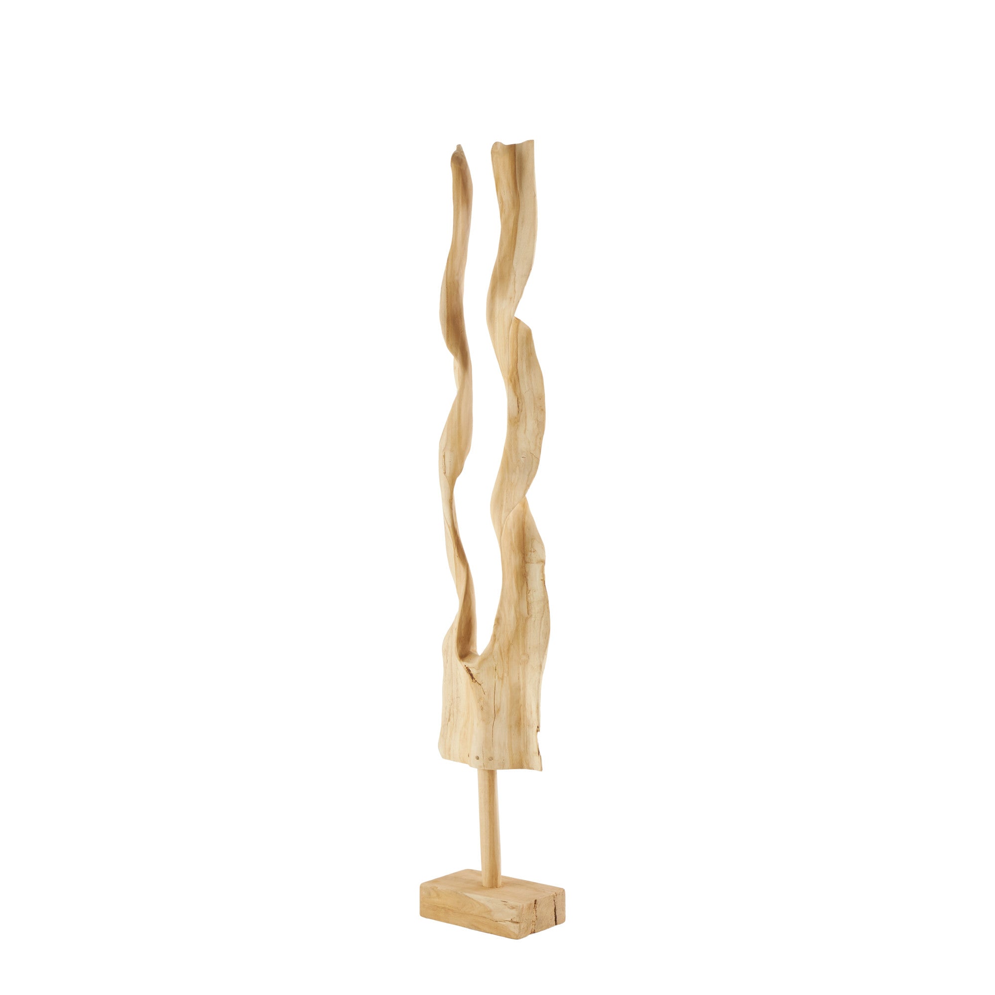 Perfect for enhancing living rooms or bedrooms, this abstract home decor statue serves as an artistic focal point. Designed with felt or rubber stoppers at the base that prevent scratching furniture and table tops, as well as sliding around. This item ships in 1 carton. Please note that this item is for decorative use only. This one-of-a-kind item is made from the stumps and unused trunks of harvested teak trees, from ecologically managed forests. Once the tree is harvested, the remaining stumps must be removed to make space to plant replacement trees. In the past, these pieces would be harvested and then burned to dispose of them. Today we use these tree stumps and trunks to create beautiful, handcrafted pieces for your home. Coloring, cracks, and shapes will vary between items. Suitable for indoor use only. This item ships fully assembled in one piece. Due to the live edges of the piece, each is unique, so no two products will have an identical pattern, shade, or cut. Made in Indonesia. This is a single statue. Natural style.