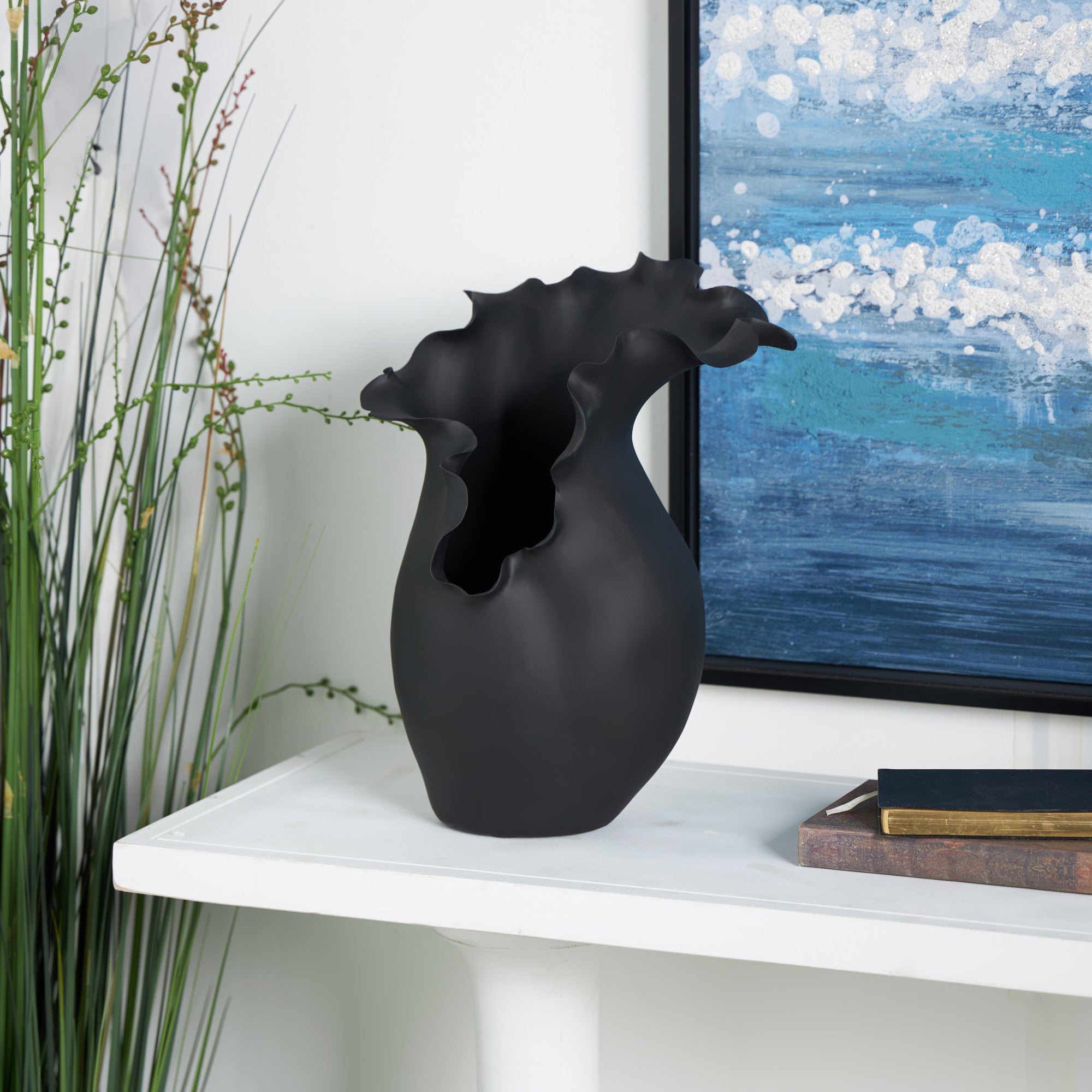 •This ceramic vase boasts an abstract floral-inspired design with a wavy edge, making it a perfect addition to any modern decor setting