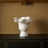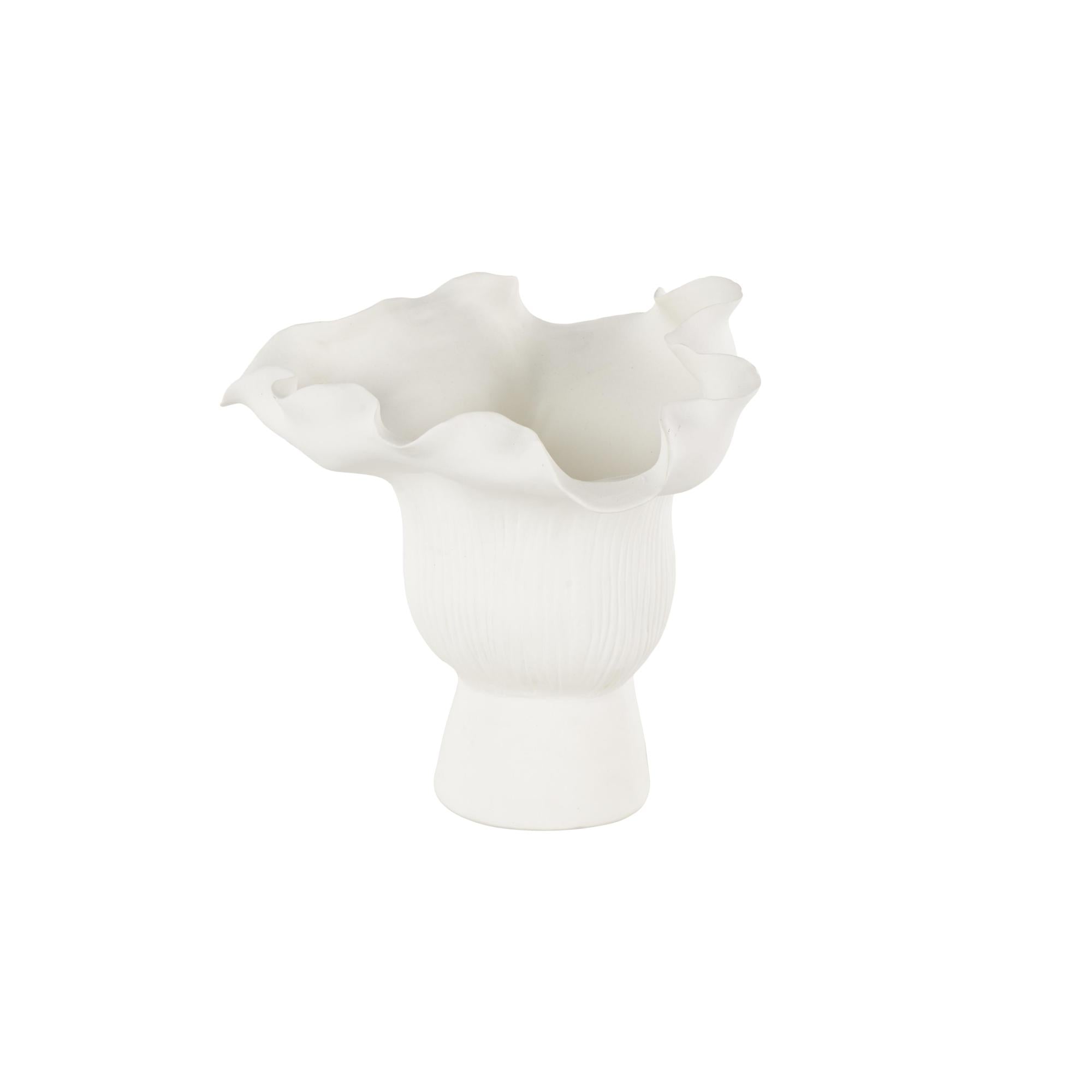 •This contemporary vase for home decor is molded with ceramic and shaped with a floral form that catches the eye