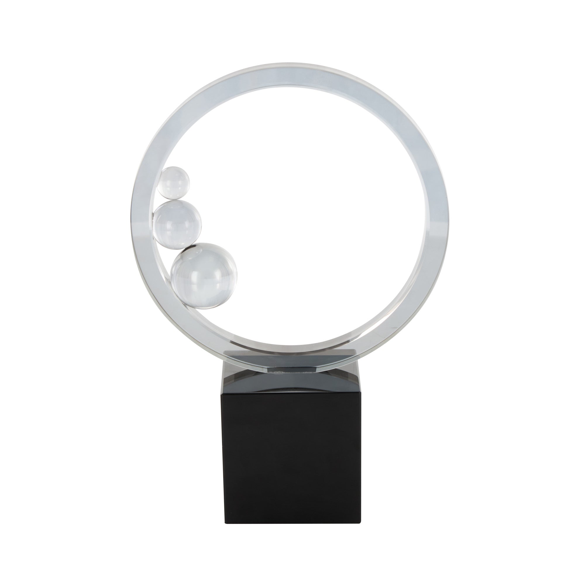 Abstract Clear Glass Ring Decorative Sculpture with Clear Orbs and Black Square Base