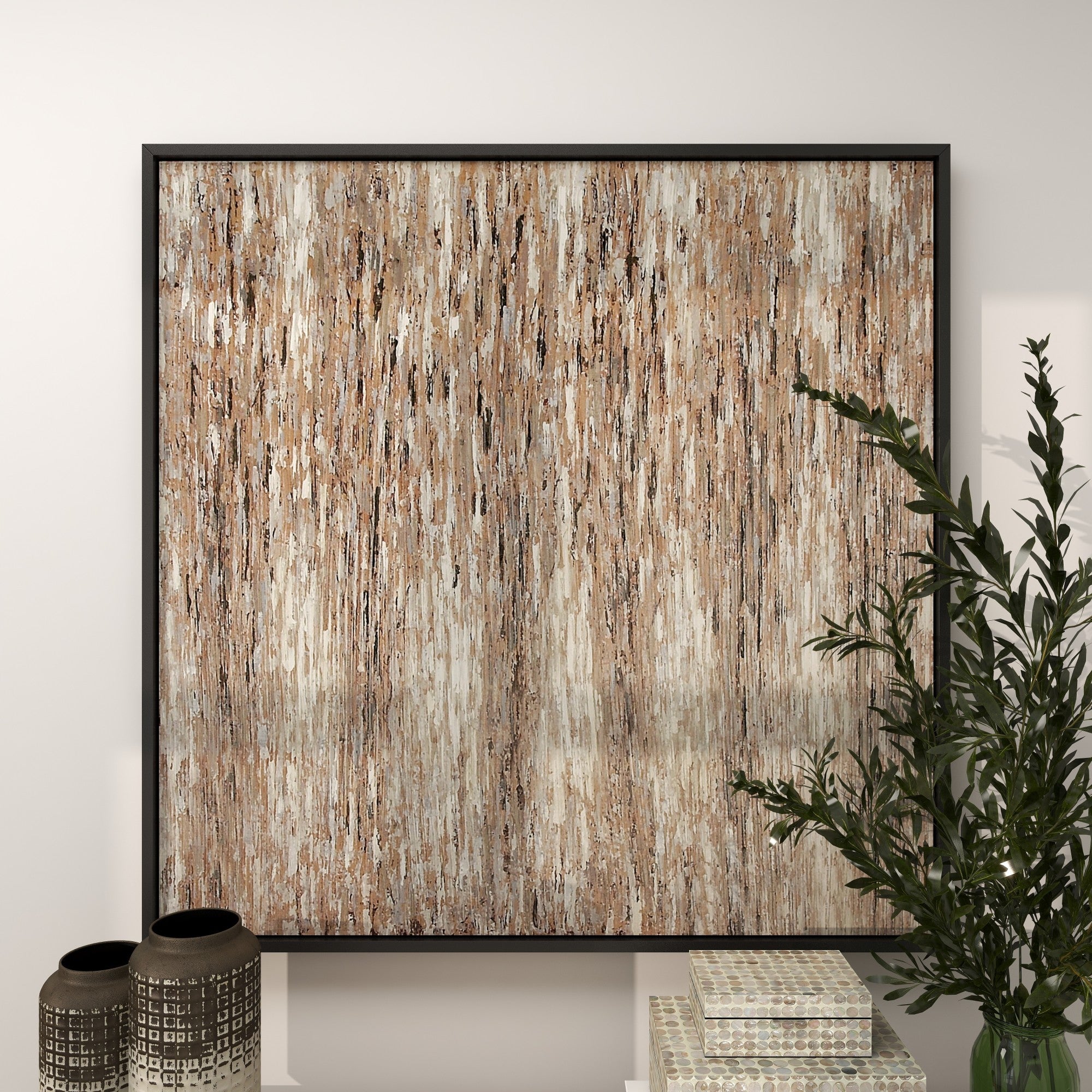 •This textured wall framed art showcases an abstract design and intricate grainy patterns within a square canvas