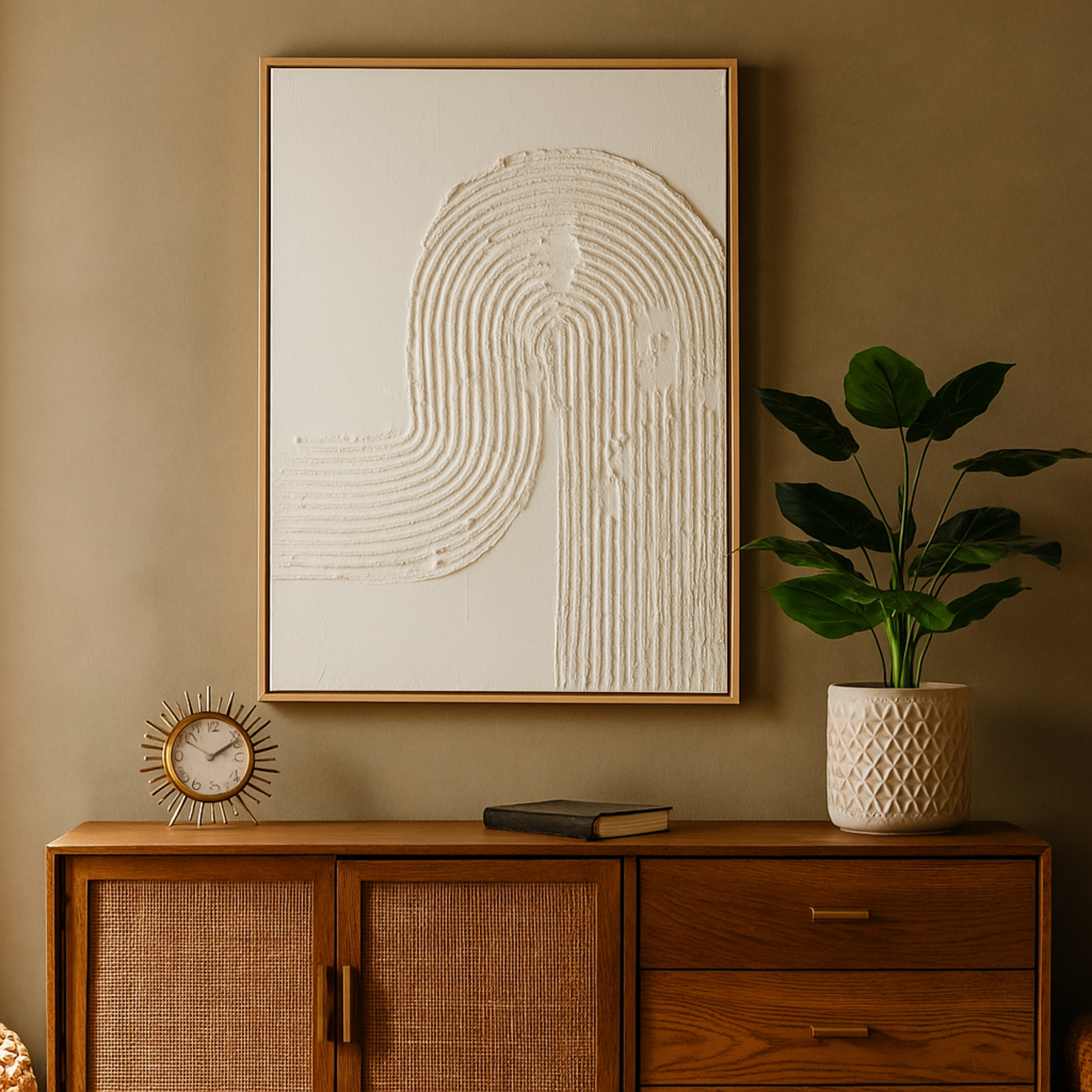 •The textured wall framed art highlights a rectangular canvas adorned with curved geometric patterns and delicate lines
