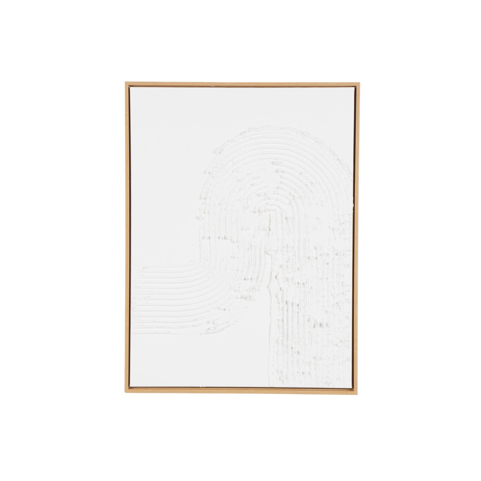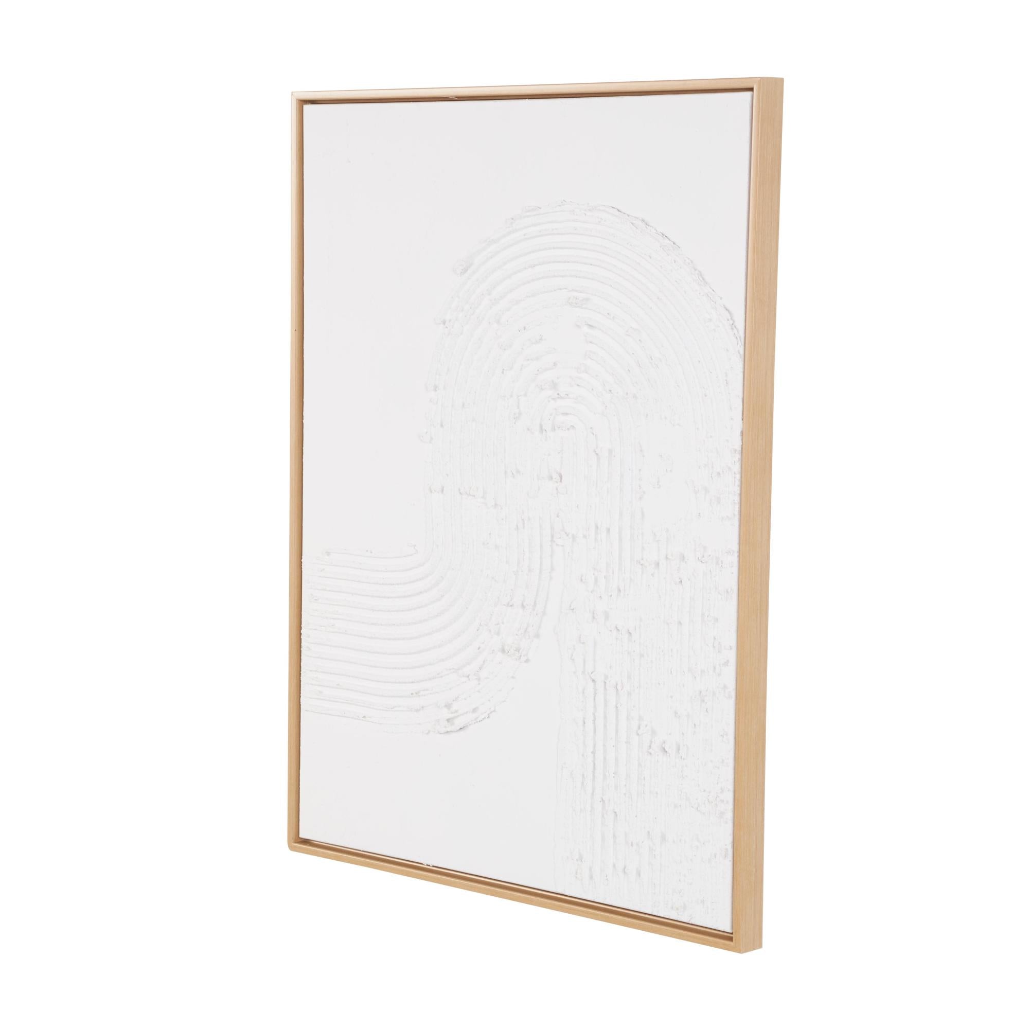 •This canvas framed wall art showcases an abstract design in white, framed by wood for a striking contrast that can elevate any decor