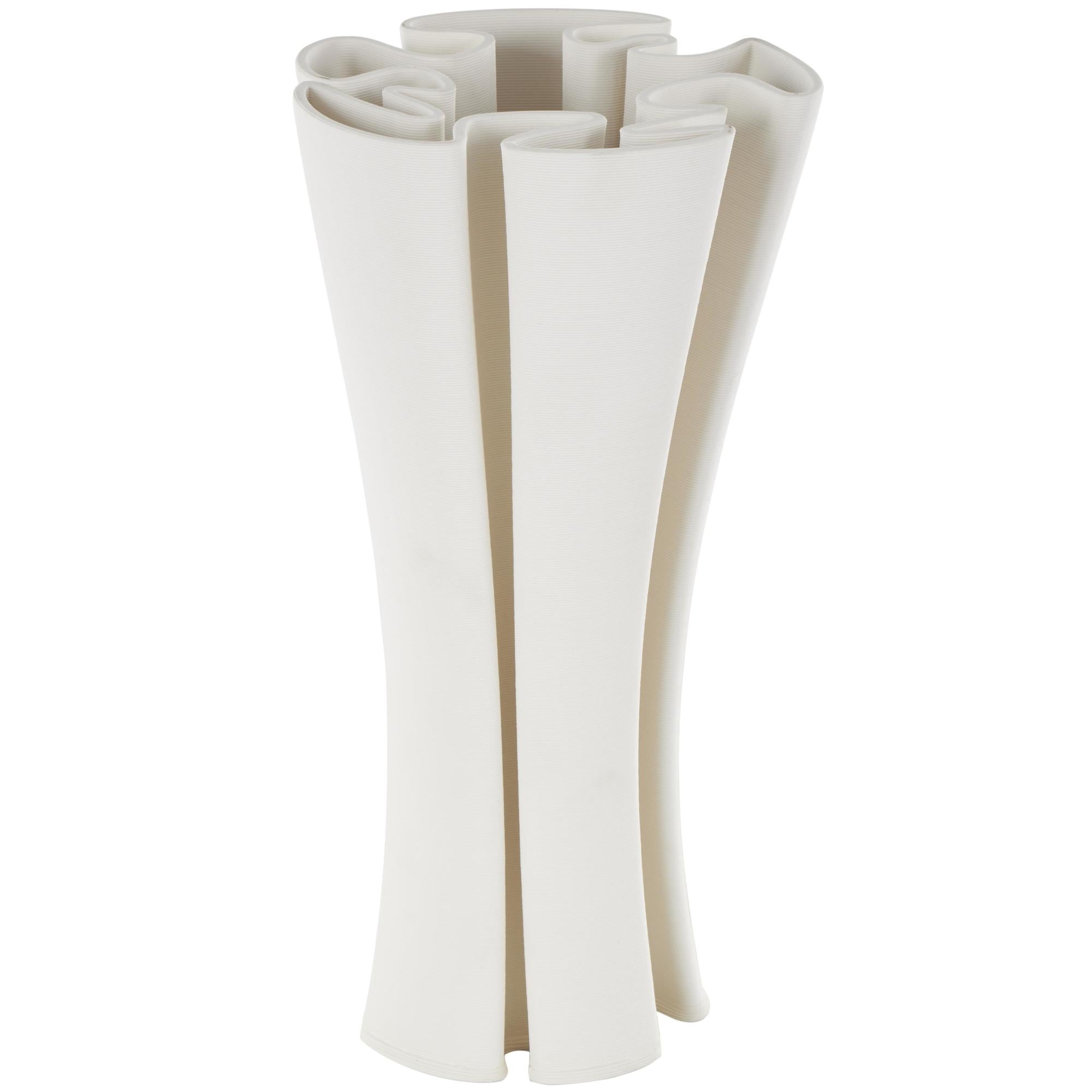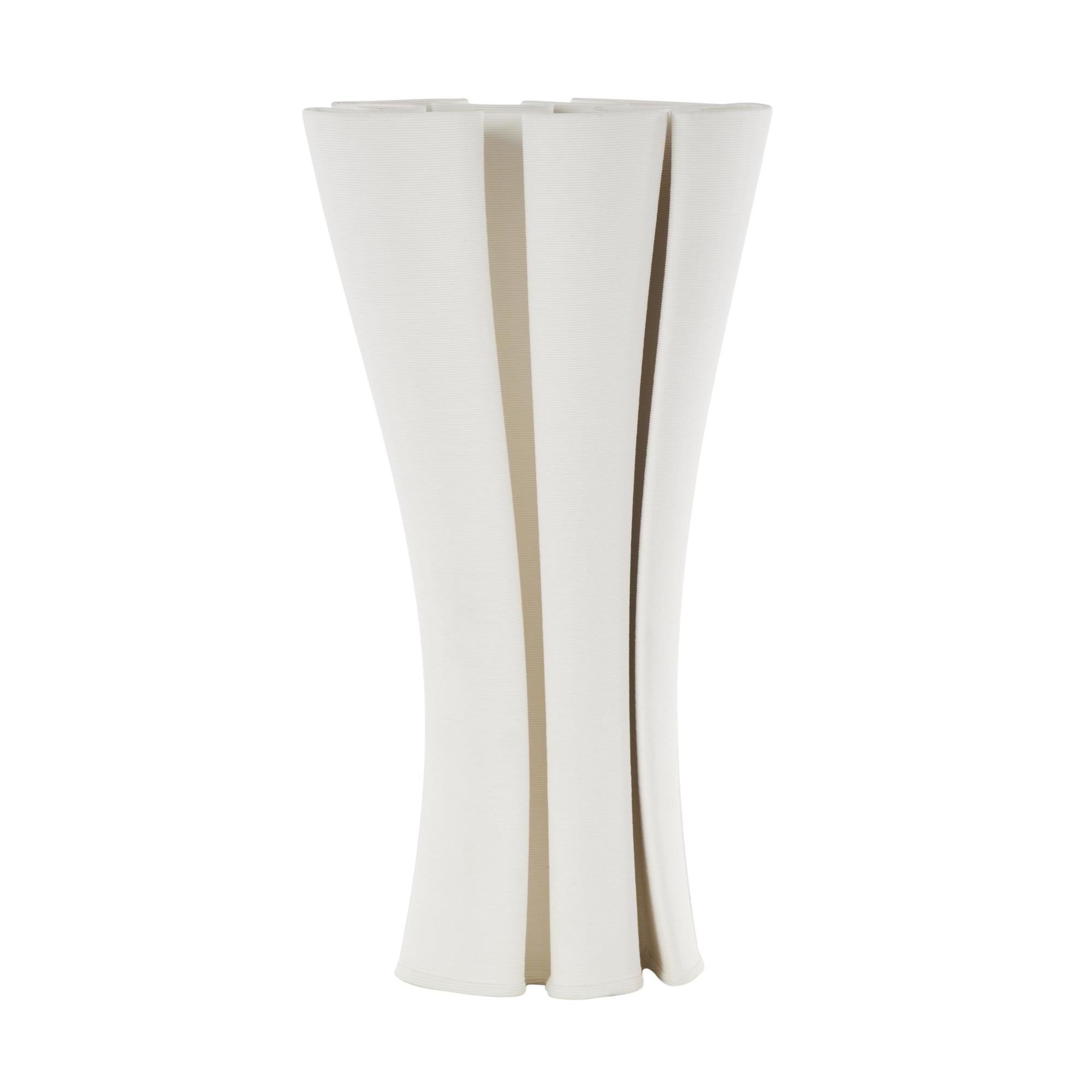 Abstract White Ceramic Ribbed Dimensional Folded Decorative Vase with Curvy Rim