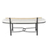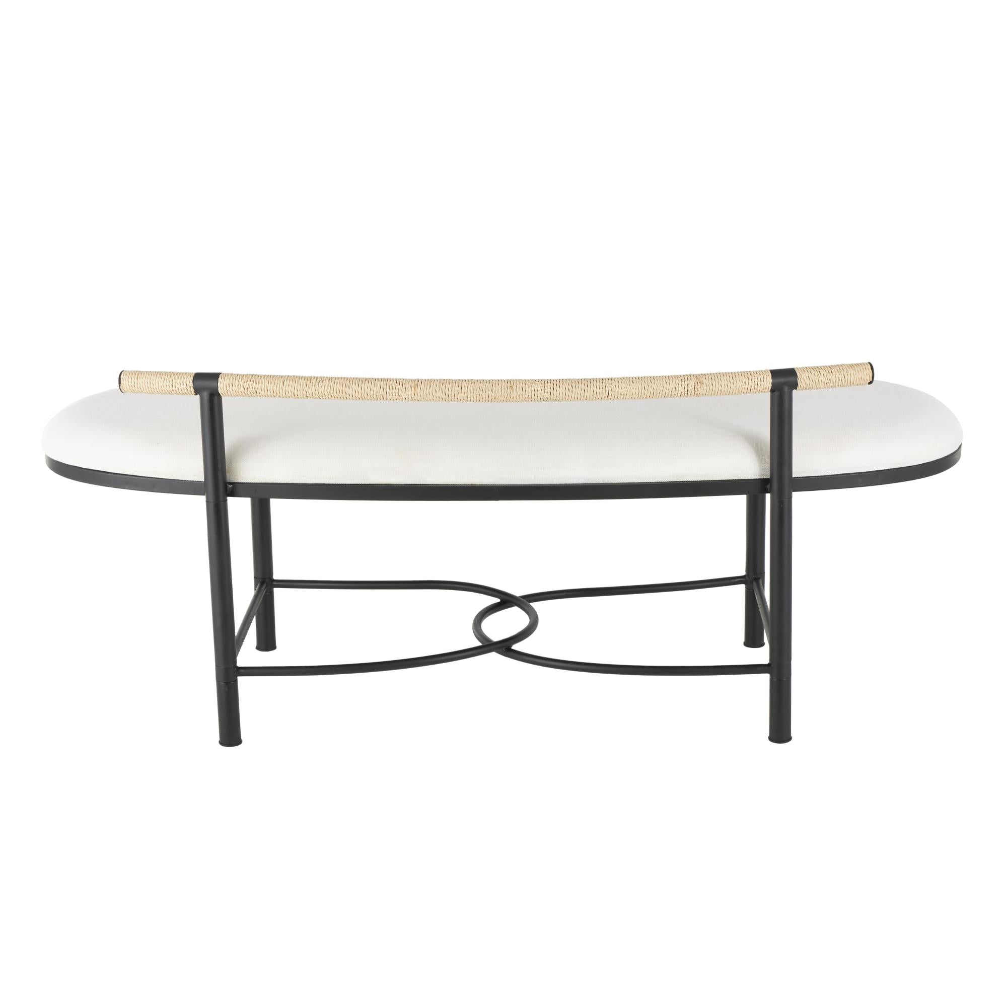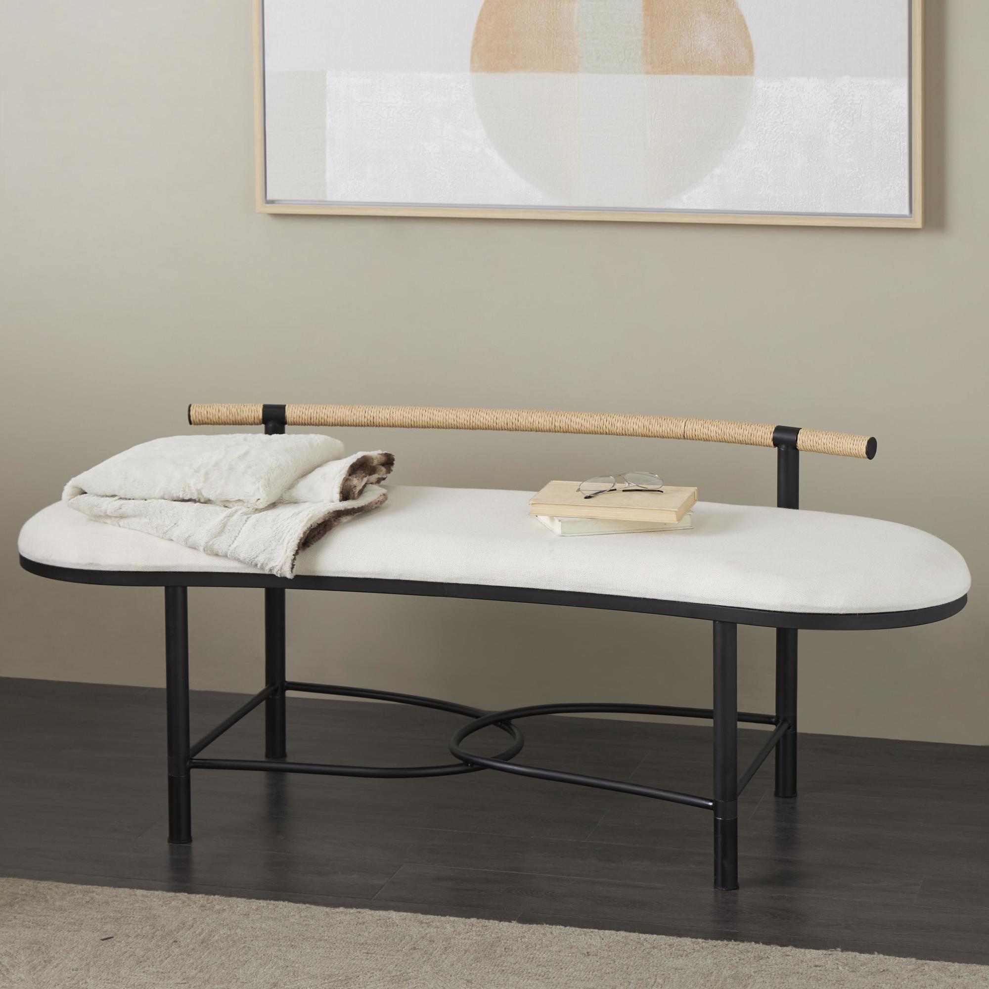 Abstract White Fabric Upholstered Oval Home Bench with Black Metal Frame and Rope Rod Backrest