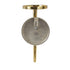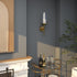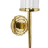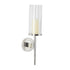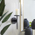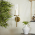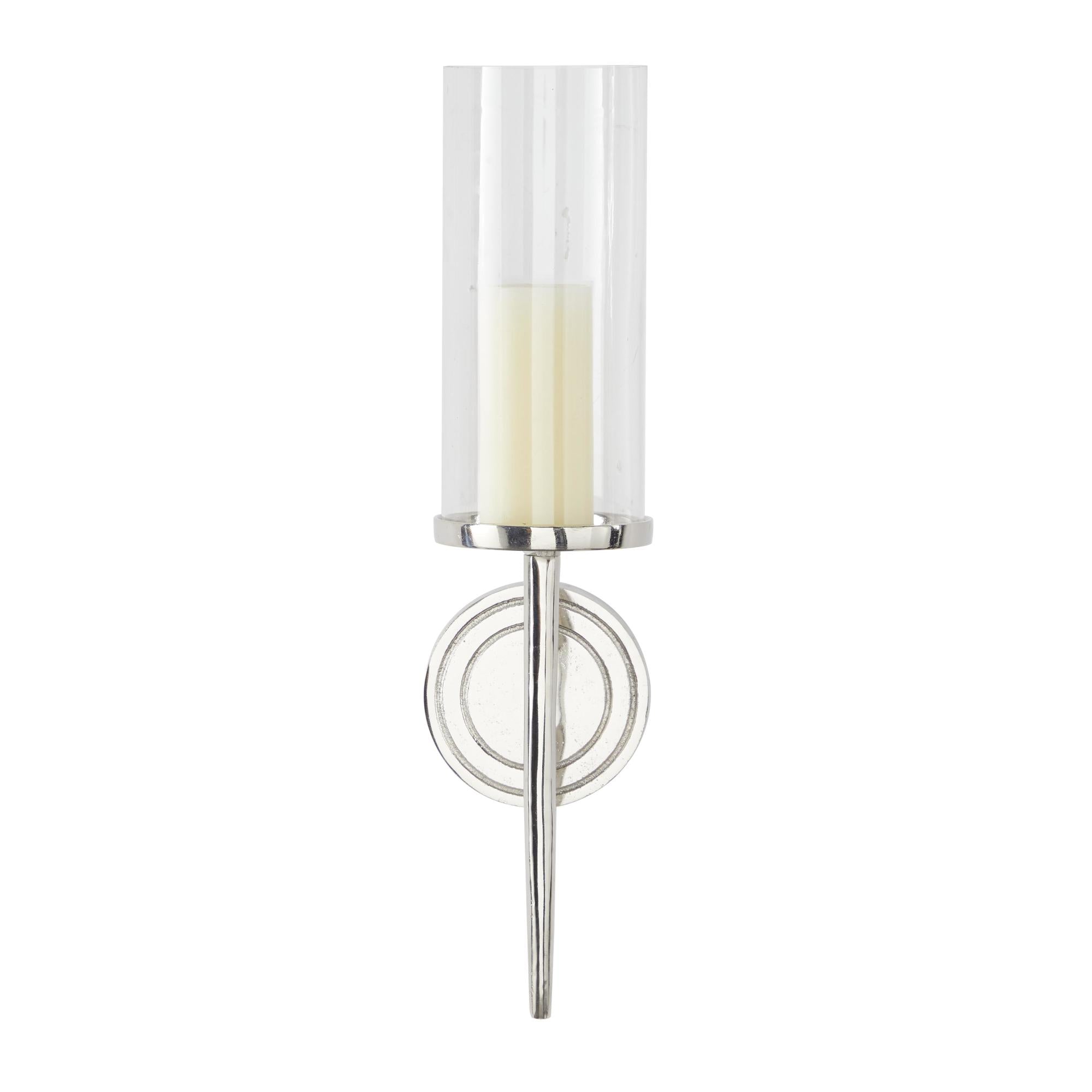 •The polished decorative wall sconce features a round wall mount and candle plate with a cylindrical glass holder and slim metal rod extending downwards