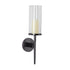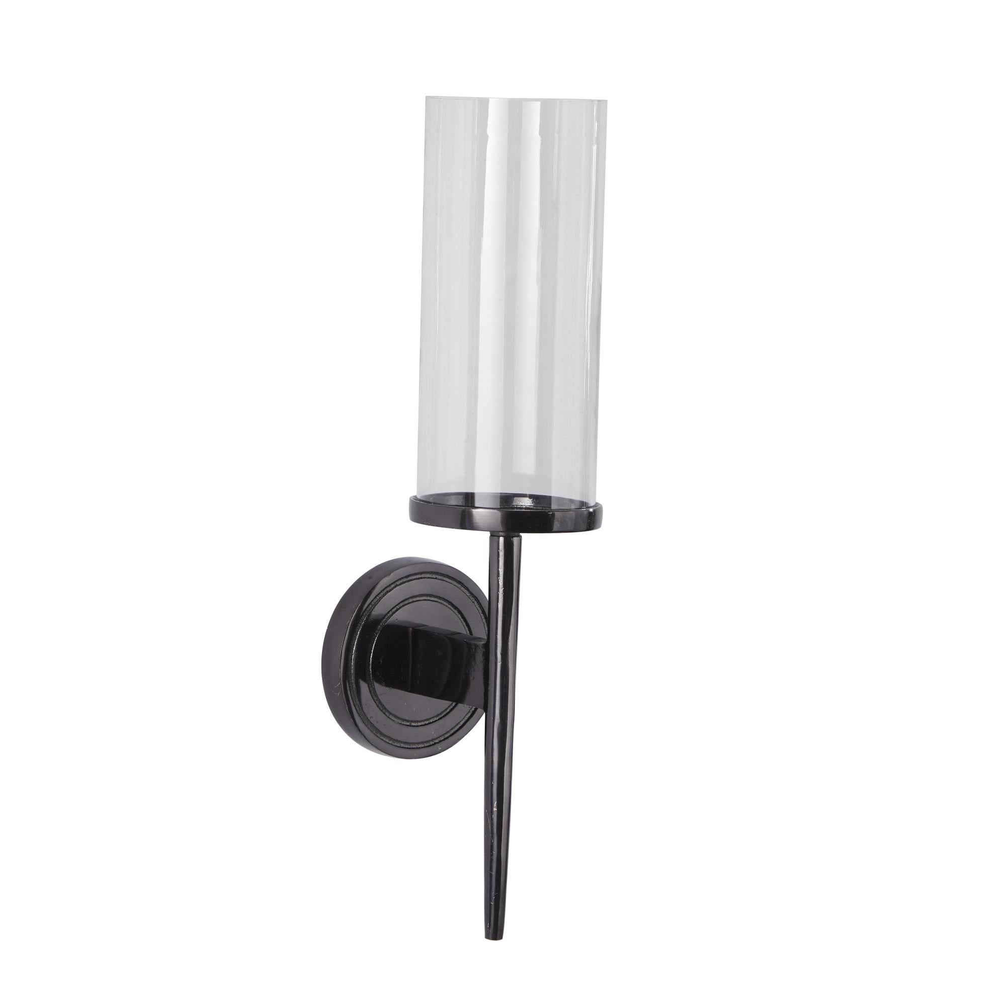 •The aluminum wall sconce showcases a tall glass holder with a pointed tail and a round wall mount for unique elegance