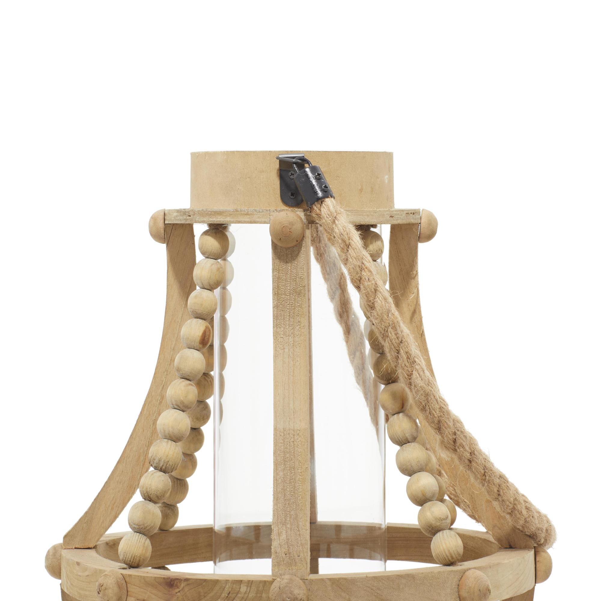 Delight your guests and make any occasion extra special by adding a lighted or flameless candle to this lantern. Made with a sturdy base, it is perfect for creating an elegant atmosphere at your table top or mantel. Perfect for entryways, side tables, console tables, hallways, and bedrooms, this lantern candle holder adds both style and function to any space. Designed with felt or rubber stoppers at the base that prevent scratching furniture and table tops, as well as sliding around. Can hold 1 pillar candle, not included. This item ships in 1 carton. Please note that this item is for decorative use only. Comes with round mouth and base, wooden beads, and rope handle.. Suitable for indoor use only. This item ships fully assembled in one piece. This is a single lantern candle holder. Farmhouse style.