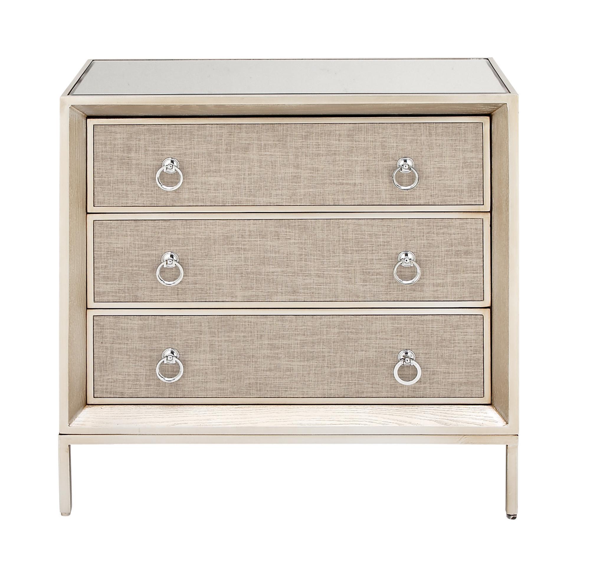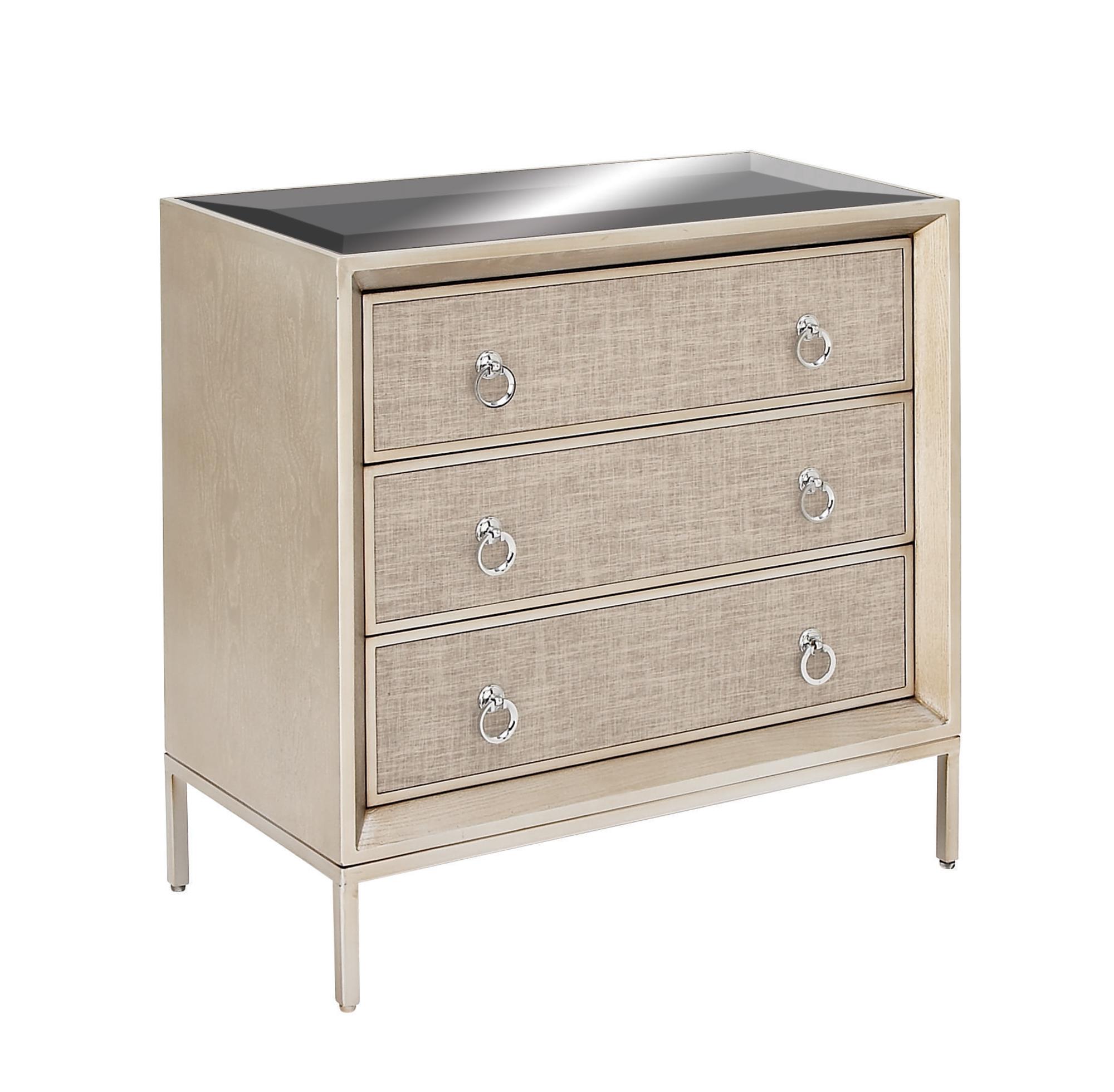 Beige Wooden Upholstered Front Panel 3 Drawer Room Chest with Mirrored Top and Ring Handles