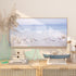 •This canvas framed wall art showcases delicate brushstrokes depicting ocean waves under a tranquil sky with birds in flight