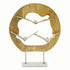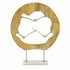 •This aluminum sculpture features a wooden round cut with three metallic bird sculptures on a stand, showcasing natural golden-brown and hues, and veined stone