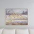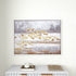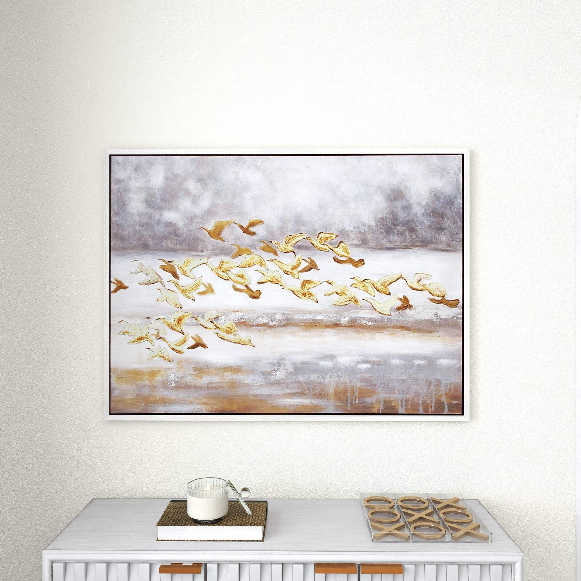 •This calming wall art features a winter setting by the lake painting of golden birds flying together