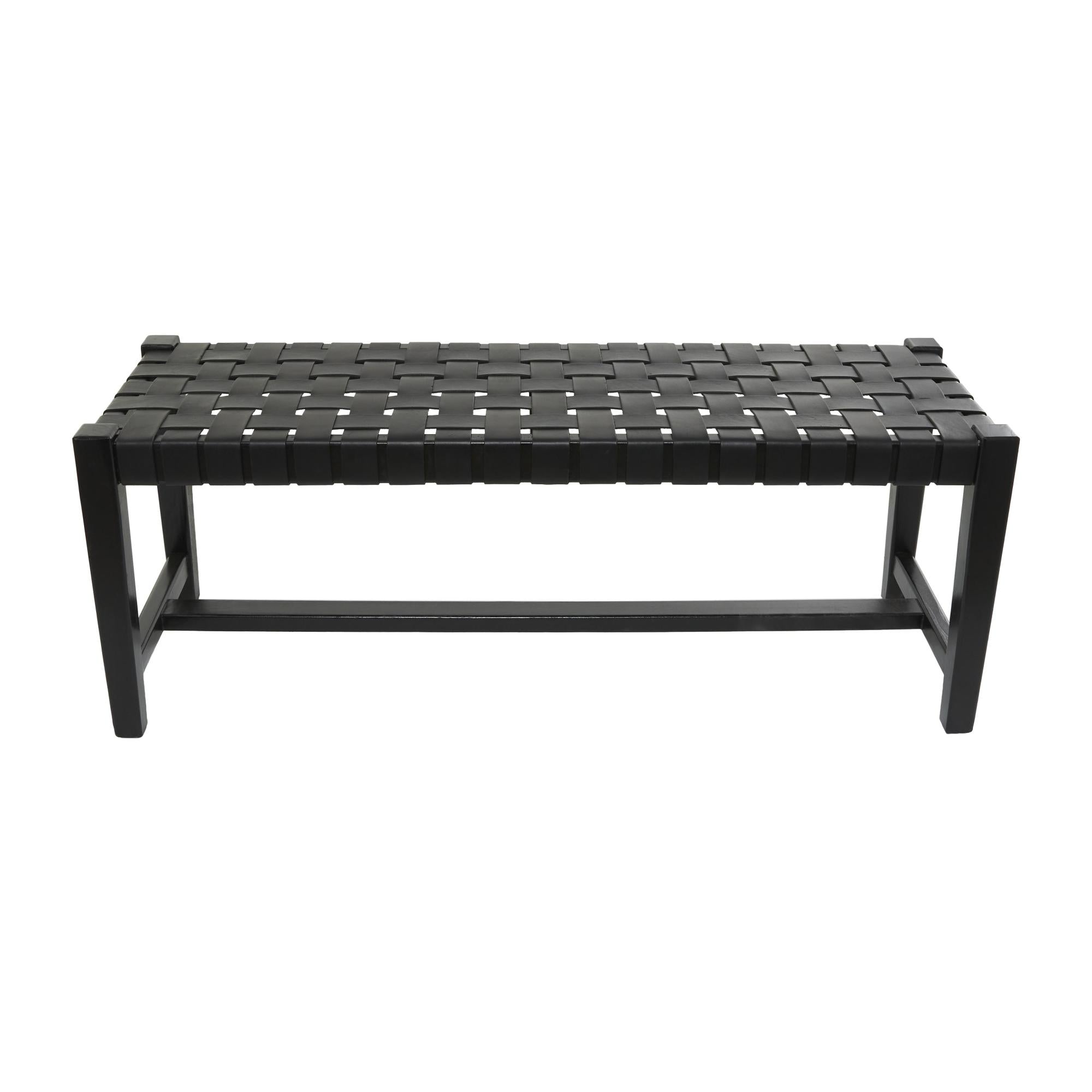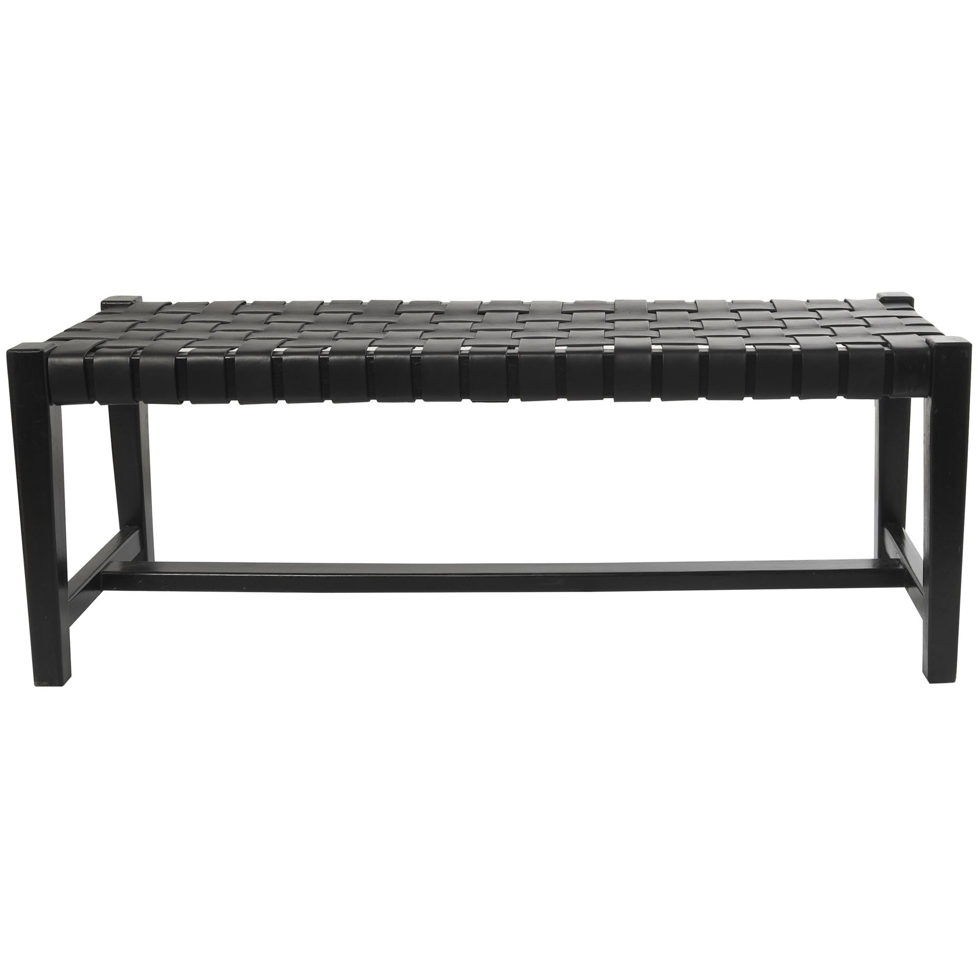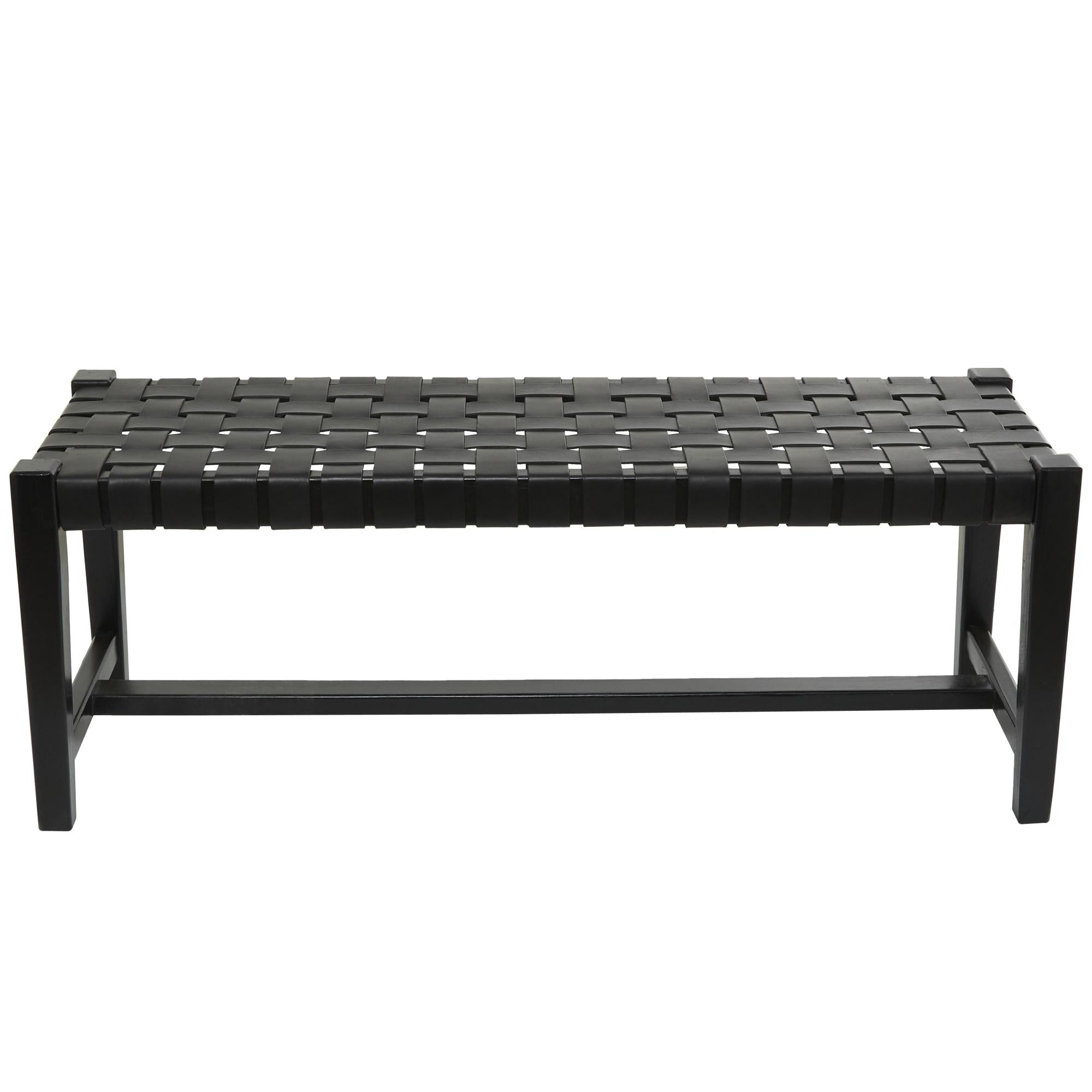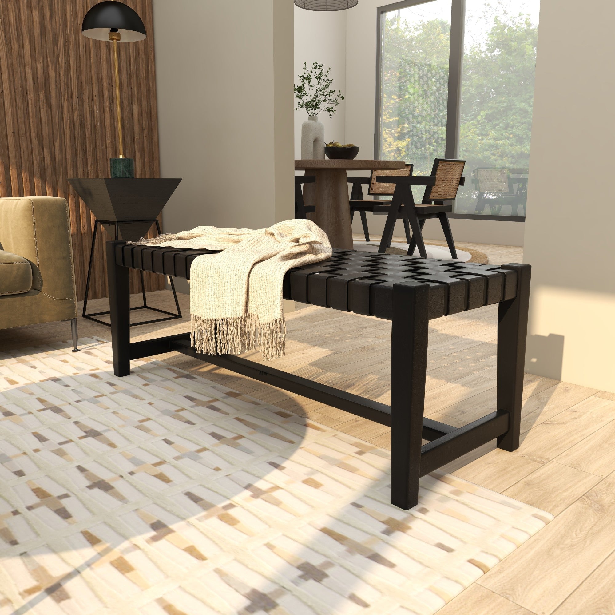 Black Leather Handmade Woven Home Bench with Teak Wood Frame