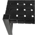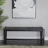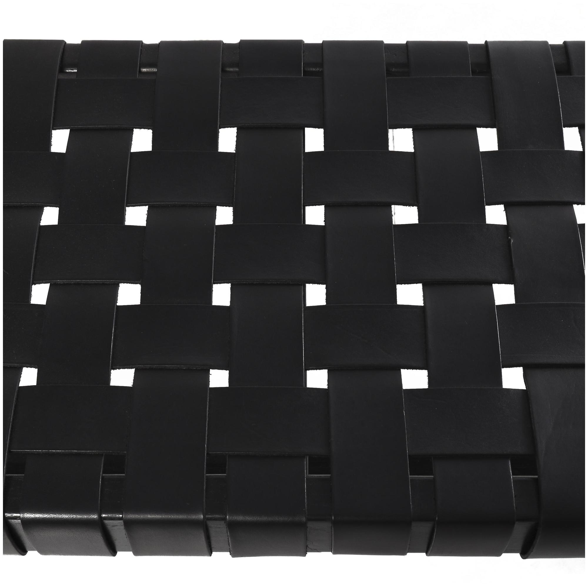 •Matte entry bench highlights a sleek rectangular structure with a woven leather seat in a grid pattern, supported by four legs and a center support beam