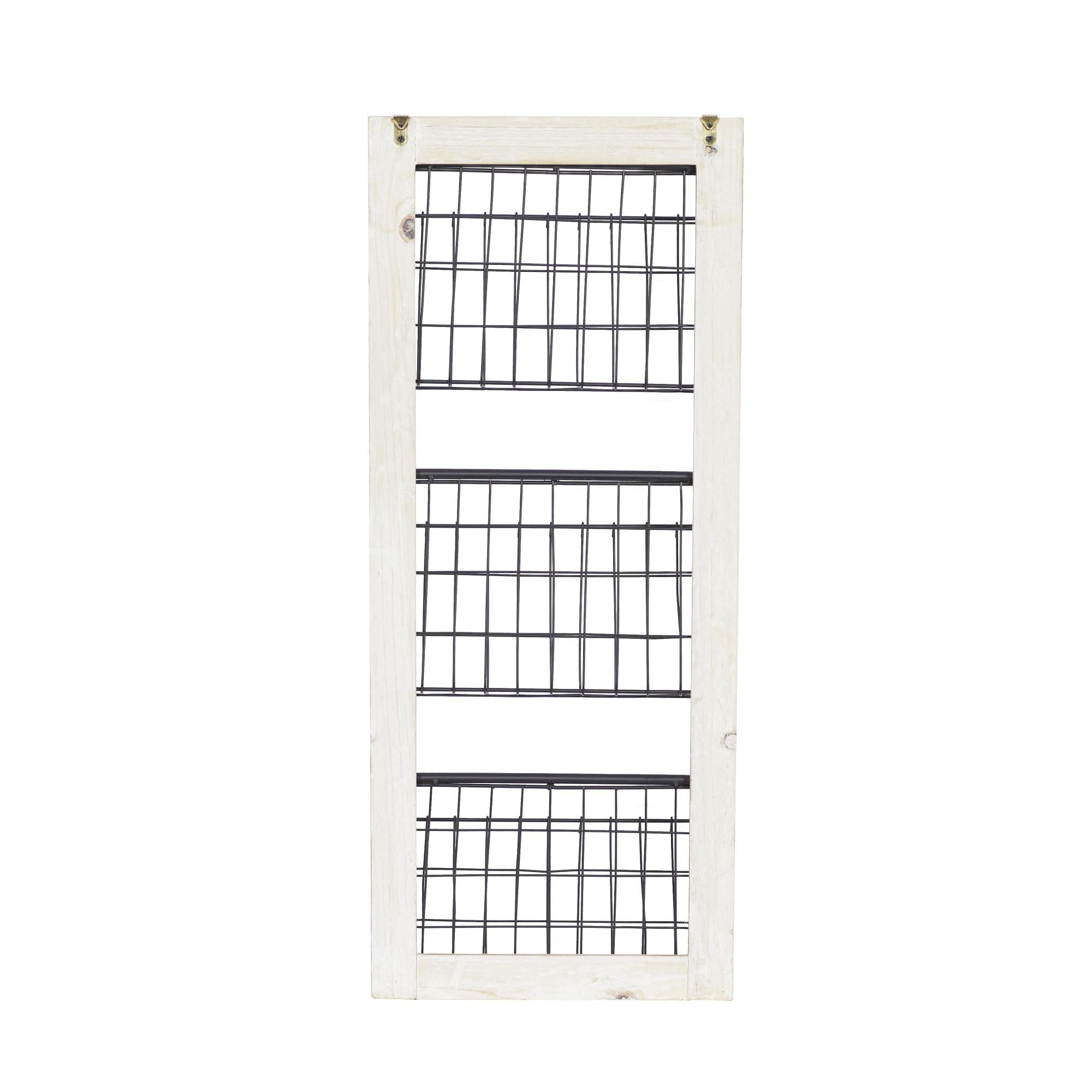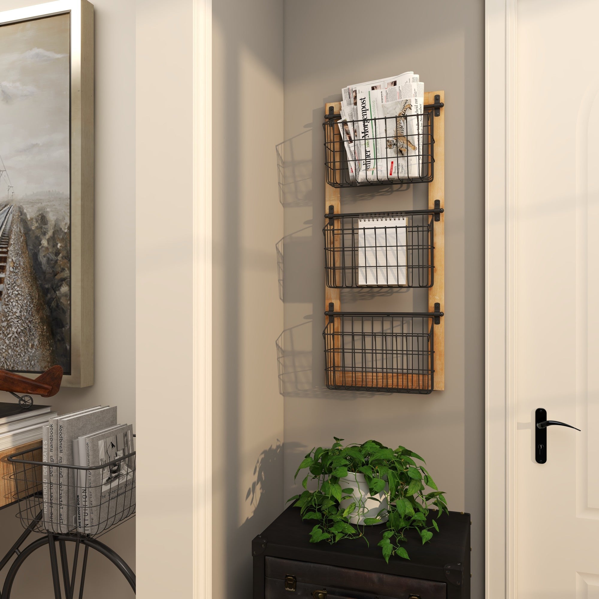 •Farmhouse magazine file holder is constructed with welded wire baskets securely fastened to the wood panel using screws for stability