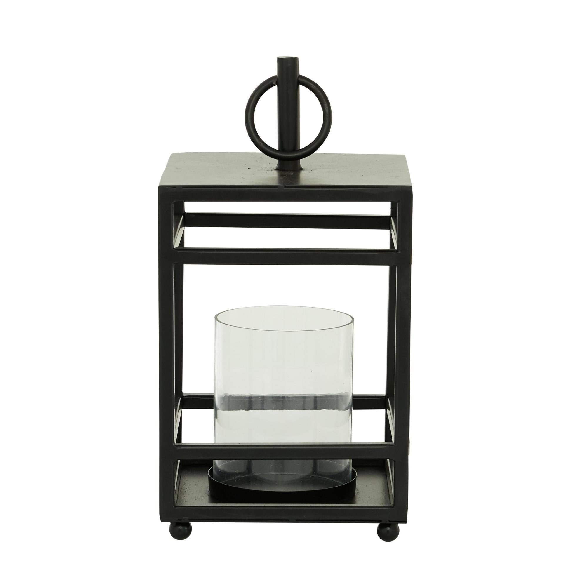 Delight your guests and make any occasion extra special by adding a lighted or flameless candle to this lantern. Made with a sturdy base, it is perfect for creating an elegant atmosphere at your table top or mantel. Place this lantern candle holder in your living room or patio to infuse your space with a romantic candlelight glow. Designed with felt or rubber stoppers at the base that prevent scratching furniture and table tops, as well as sliding around. Can hold 1 pillar candle, not included. This item ships in 1 carton. Please note that this item is for decorative use only. Lantern has a ring handle and a glass tube at the center.. Suitable for indoor use only. This item ships fully assembled in one piece. Made in India. This is a single lantern candle holder. Contemporary style.