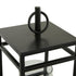 •Contemporary candle holder lantern showcases a glass tube mounted on a platform encased in an open welded metal frame, blending form with function