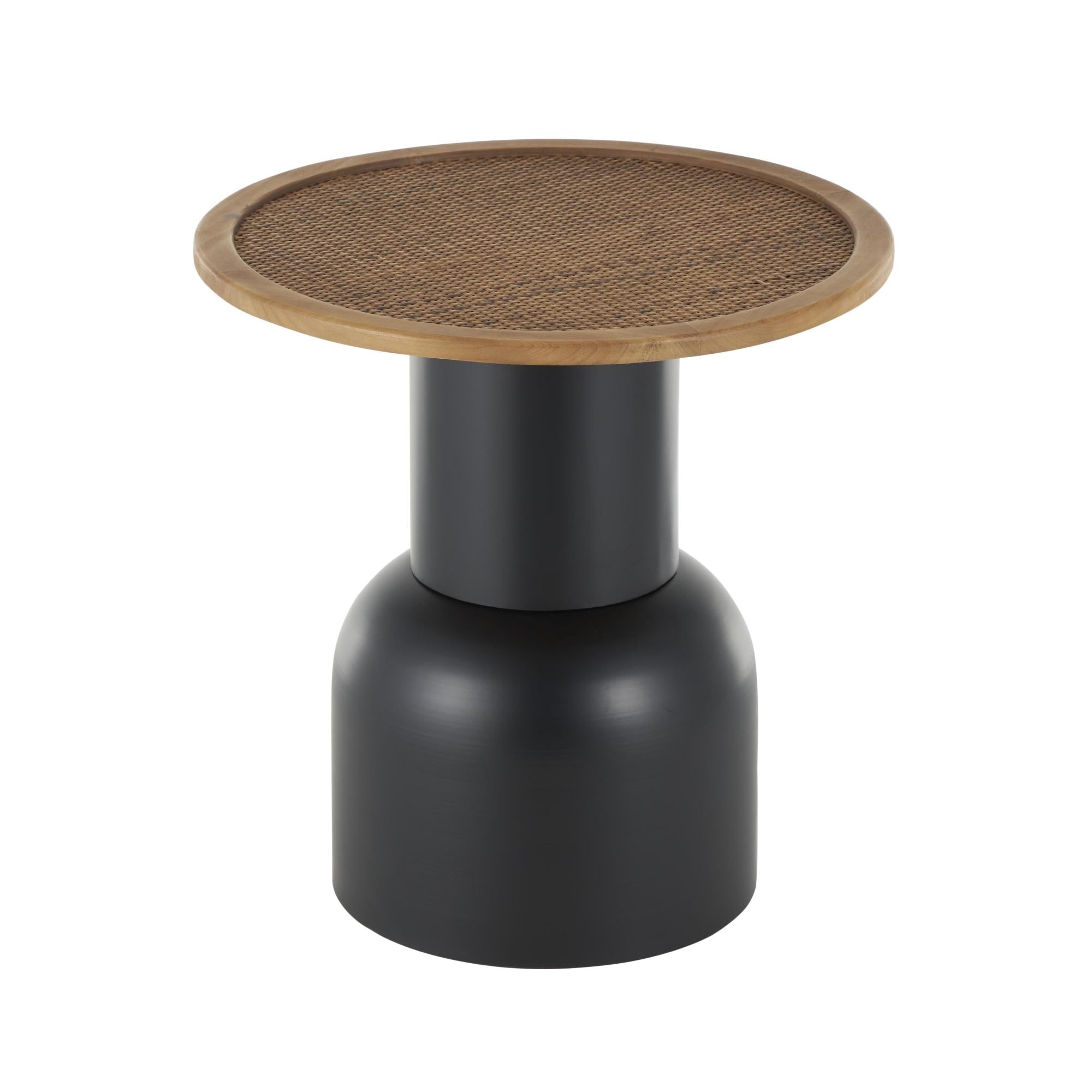 •This Iron accent table is characterized by its rattan tabletop, lending an organic texture to its overall appearance