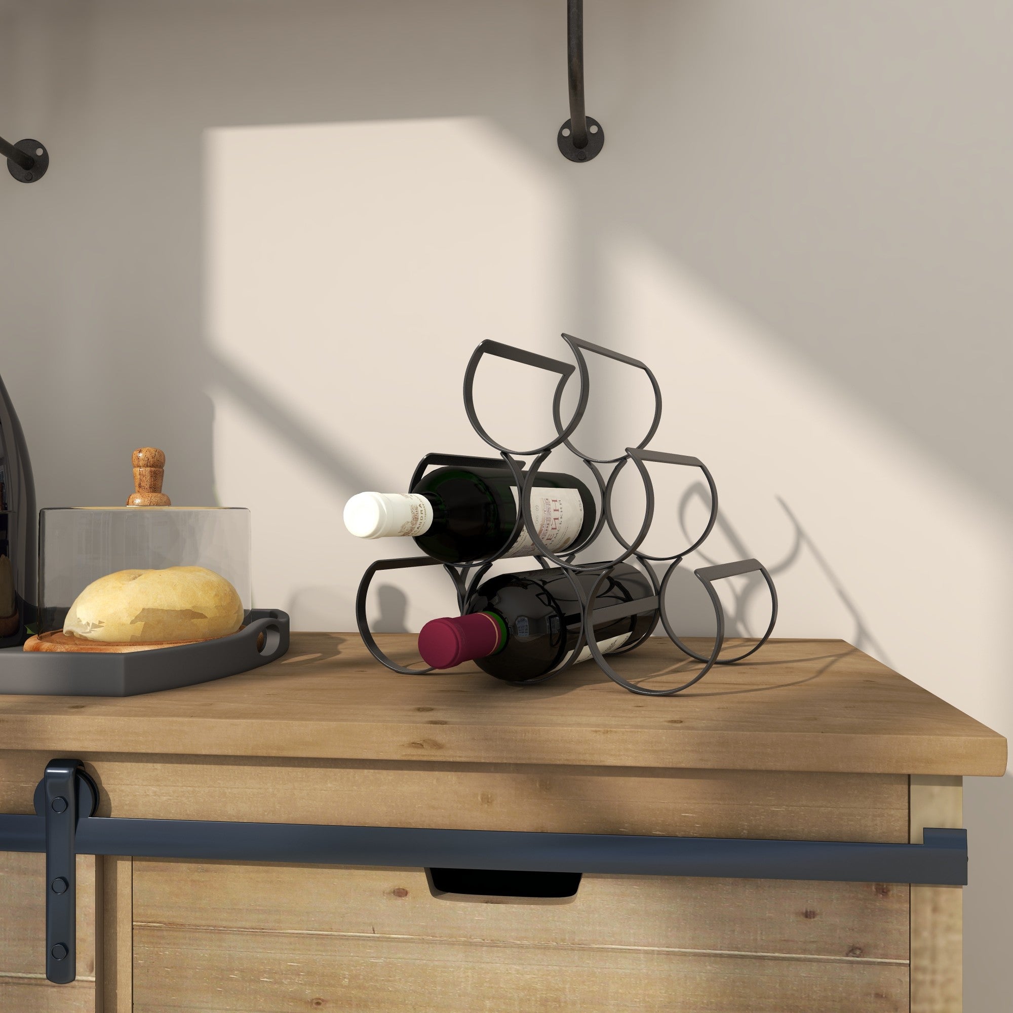 Place the wine bottle display on your kitchen counter to stylishly organize and showcase your collection. This item ships in 1 carton. Suitable for indoor use only. This item ships fully assembled in one piece. Maximum weight limit is 10 lbs. This is a single tabletop wine bottle holder. Industrial style. wine rack can hold 6 average wine bottles.