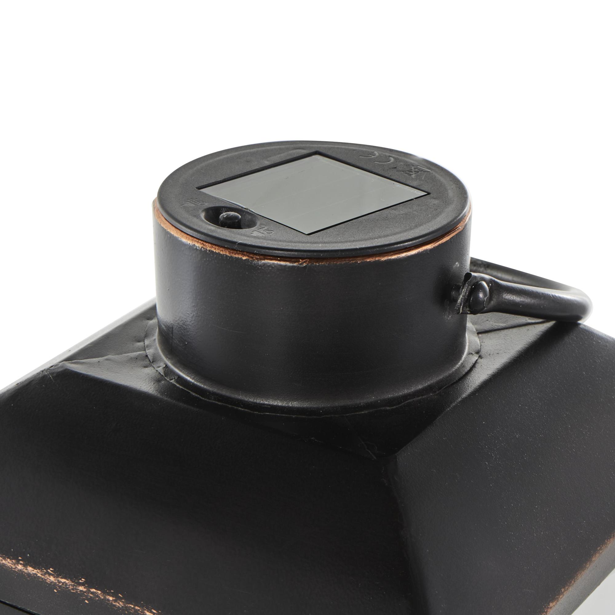 •The industrial candle holder lantern features cut and welded iron for the frame securing the glass panels, with a handle attached