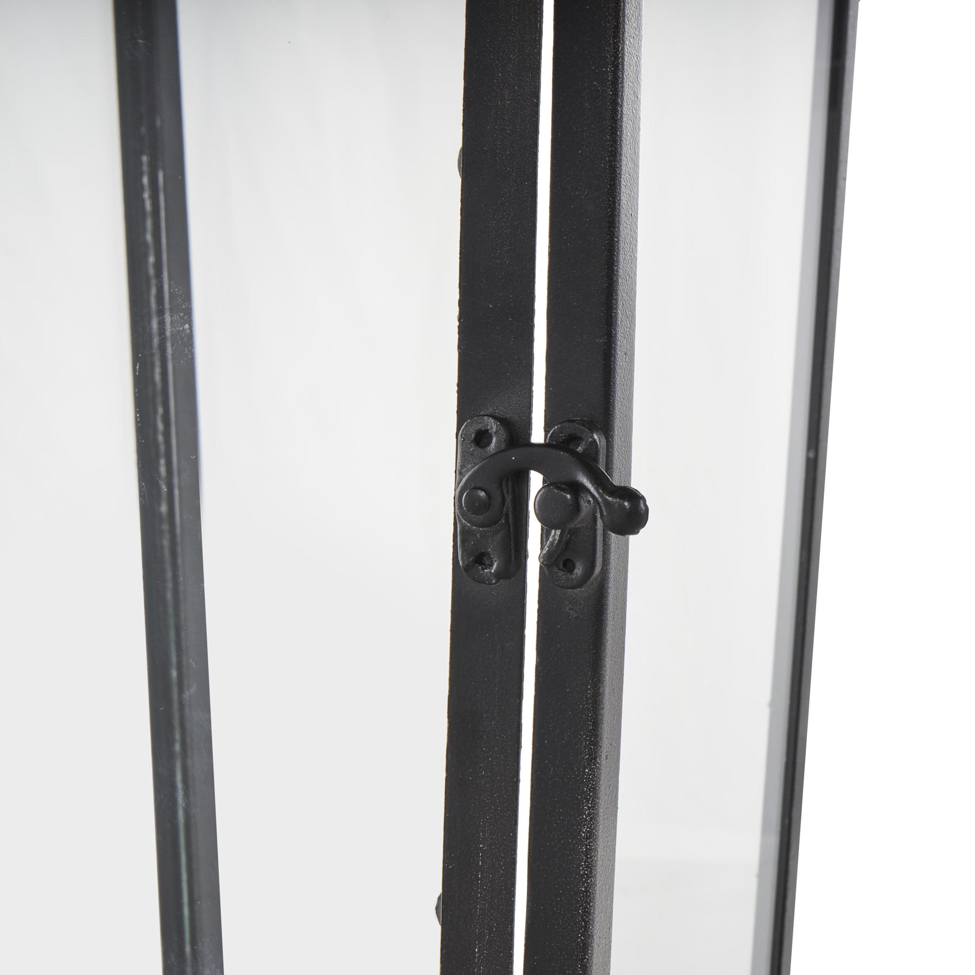 •The indoor outdoor candle lantern set is crafted from iron and glass, ensuring durability and elegance