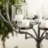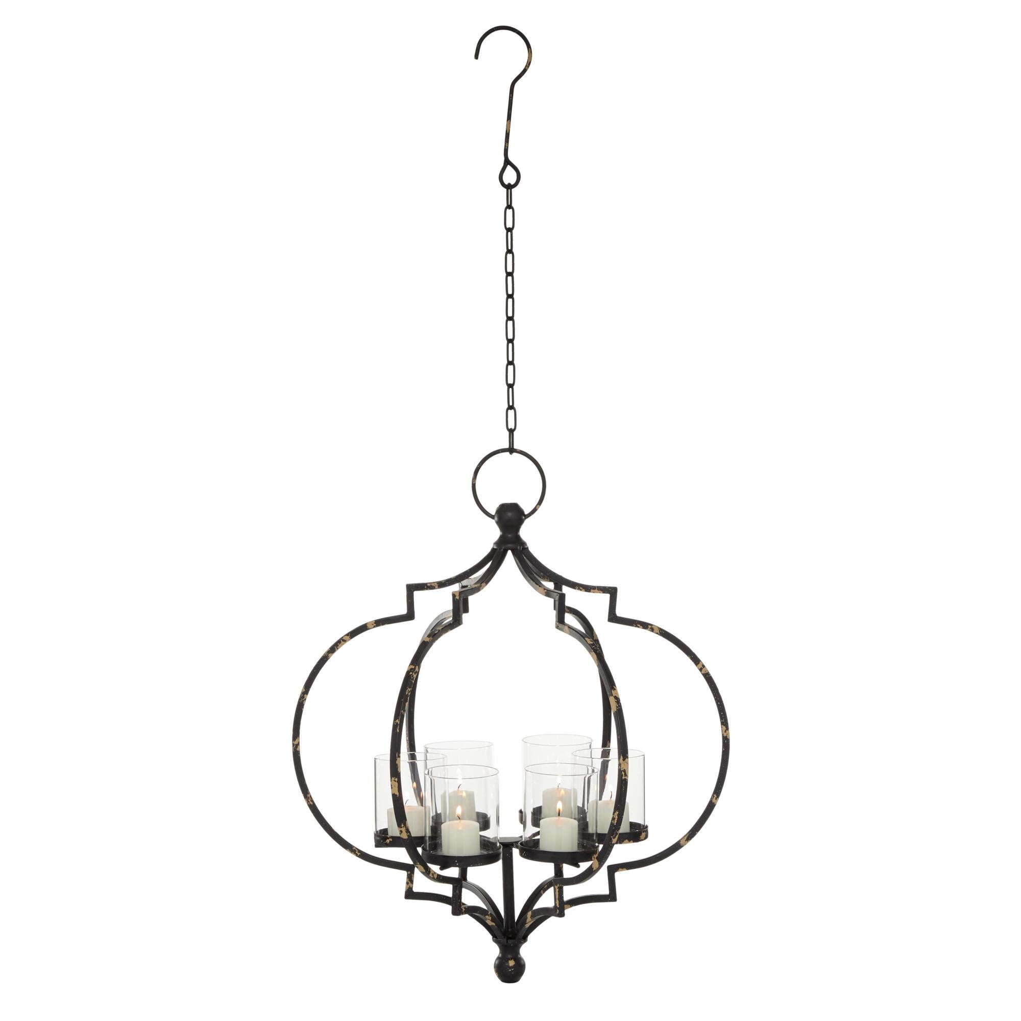 •The farmhouse decorative candleholder is forged from iron to form an open structure suspended on a chain hook and furnished with six meticulously cut-glass holders