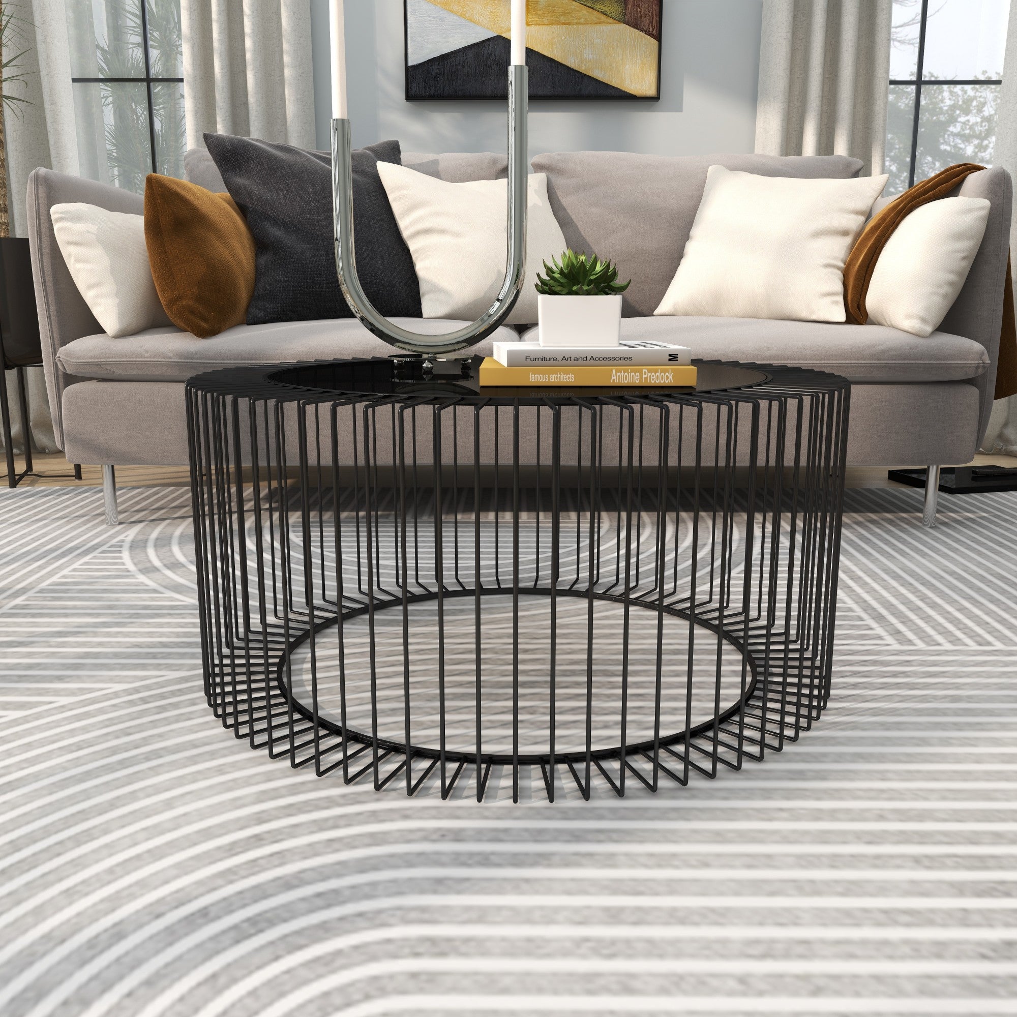 Black Metal Open Wire Frame Living Room Coffee Table with Shaded Glass Top