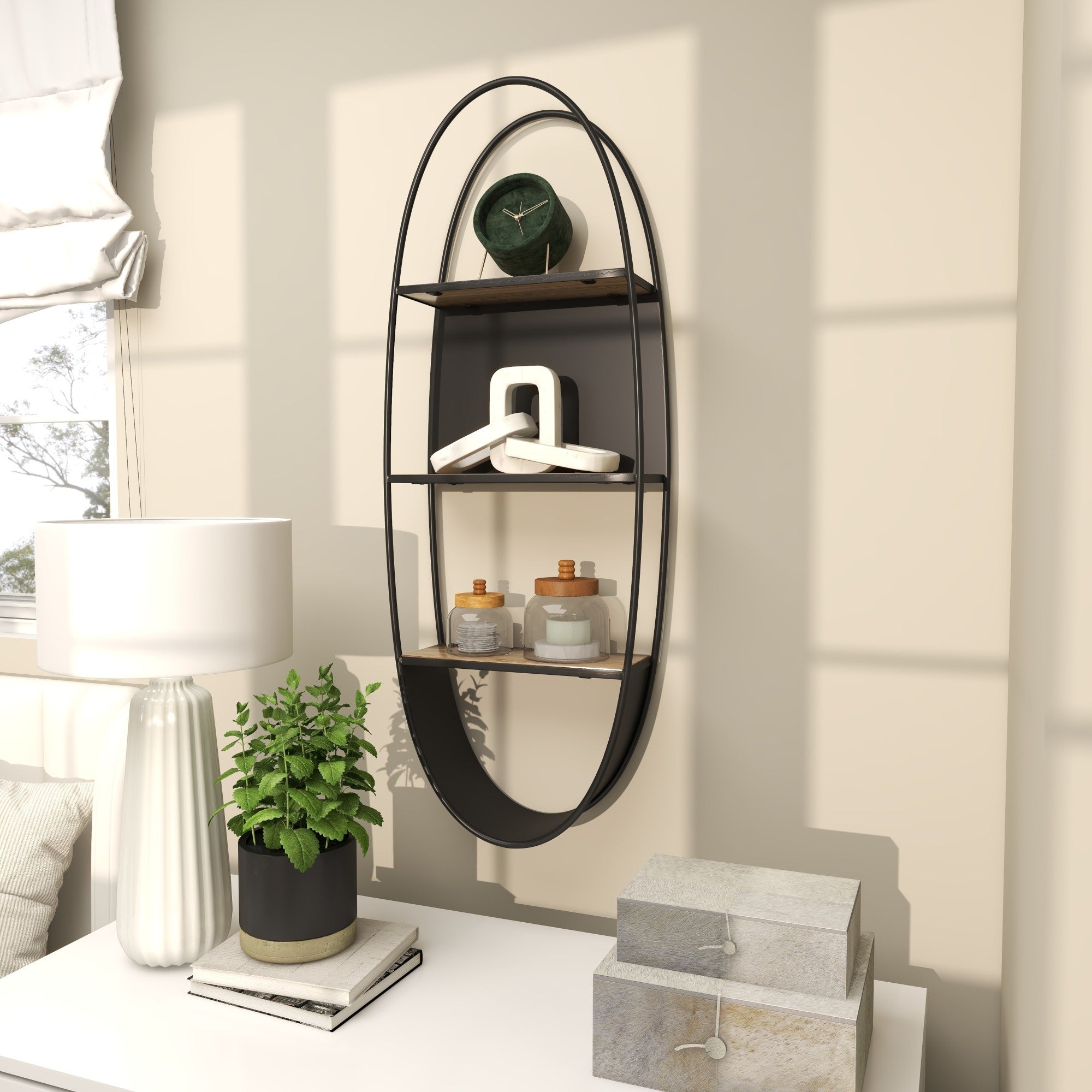 •Matte room floating shelf accentuates an elongated oval frame with rectangular shelves, adding visual interest