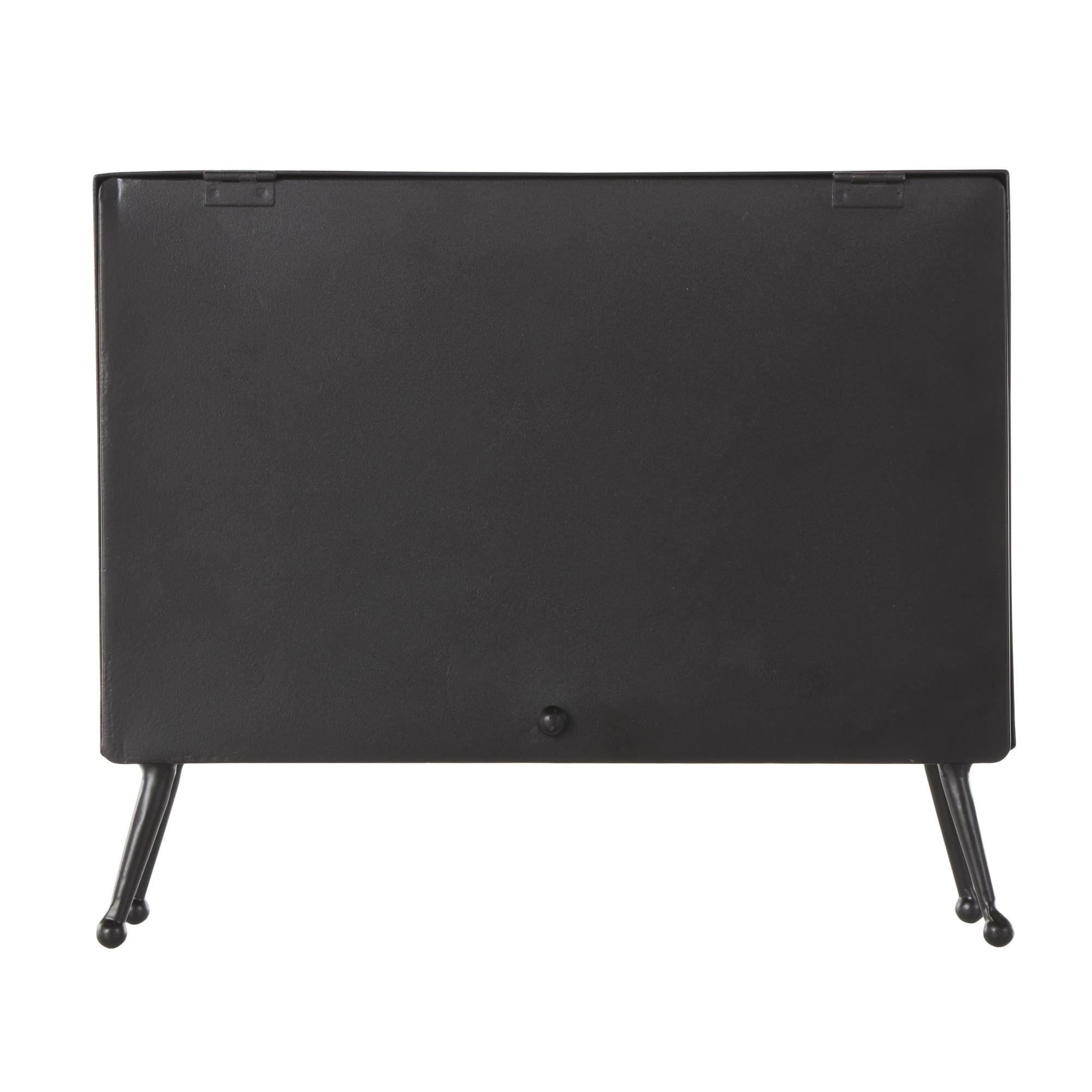 •The matte clock for decor boasts an industrial design with its rectangular frame with a grid clock face standing on four legs with ball accents