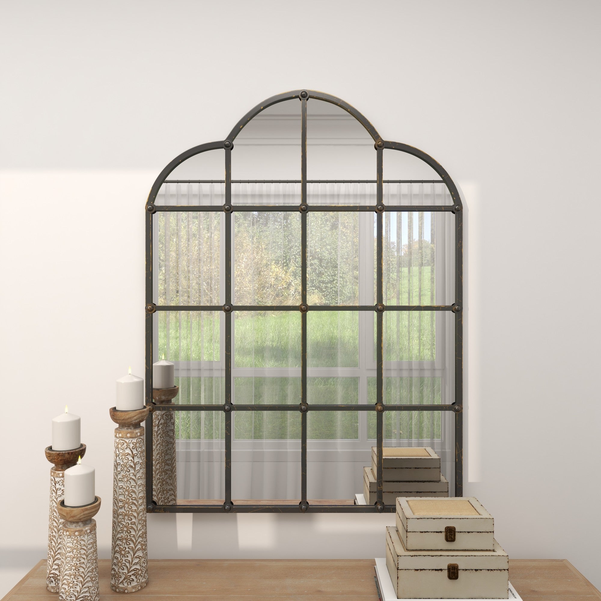 Black Metal Window Pane Inspired Room Wall Mirror with Arched Tops and Studs