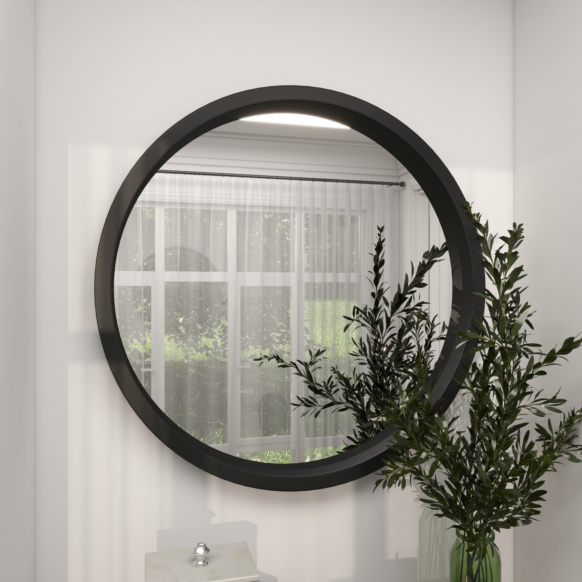 •This matte mirror for wall features a minimalistic, black-framed round mirror design, perfect for modern decor
