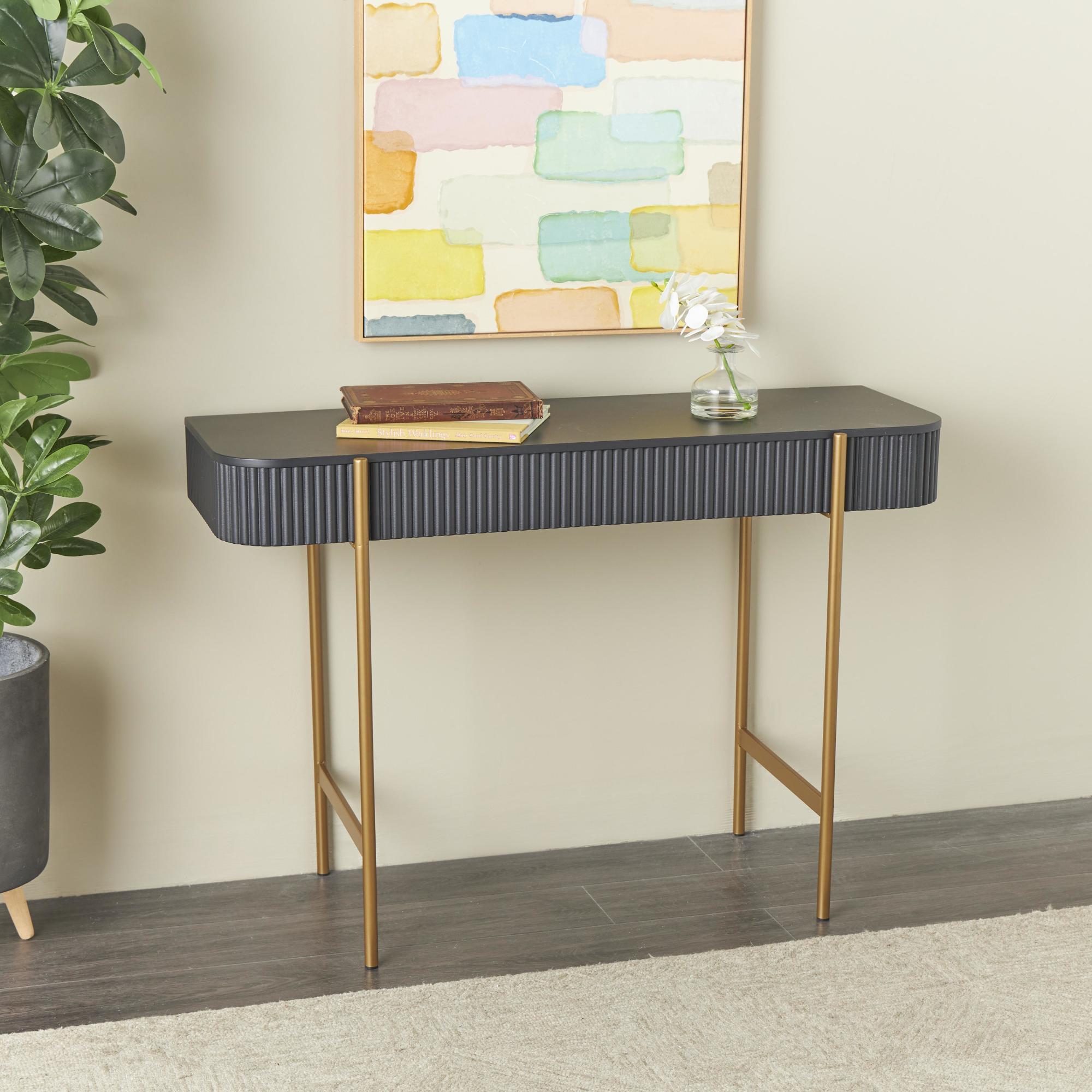 Black Wooden Rounded Rectangular Fluted Living Room Console Table with Gold Metal Legs