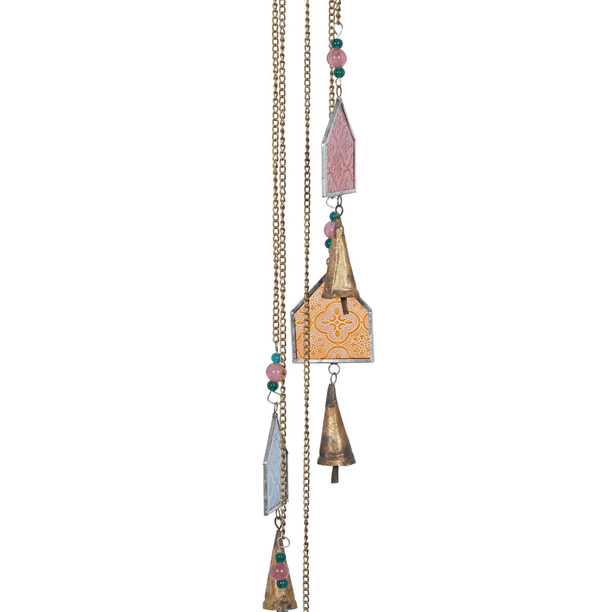 •This eclectic wall art windchime features a molded glass bottle and house-shaped pieces suspended on a string along with welded iron bells