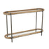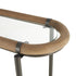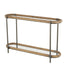 Brass Metal Oval Living Room Console Table with Brown Wooden Framed Glass Tabletop