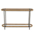 •The iron console table features a glass tabletop offering versatile display options and one lower shelf for additional storage