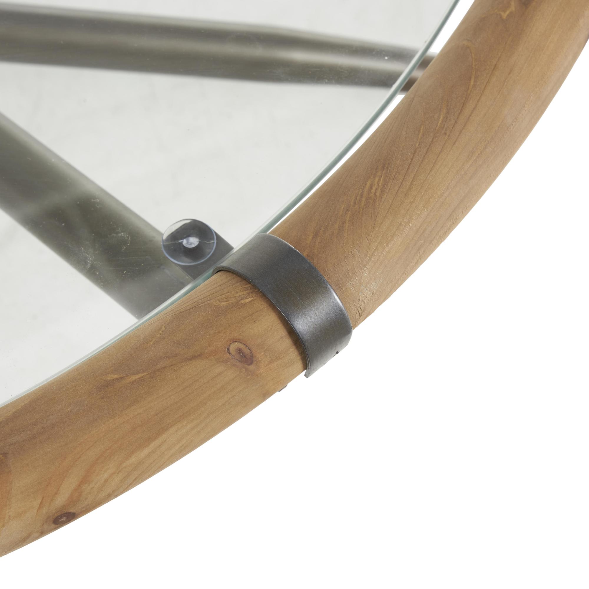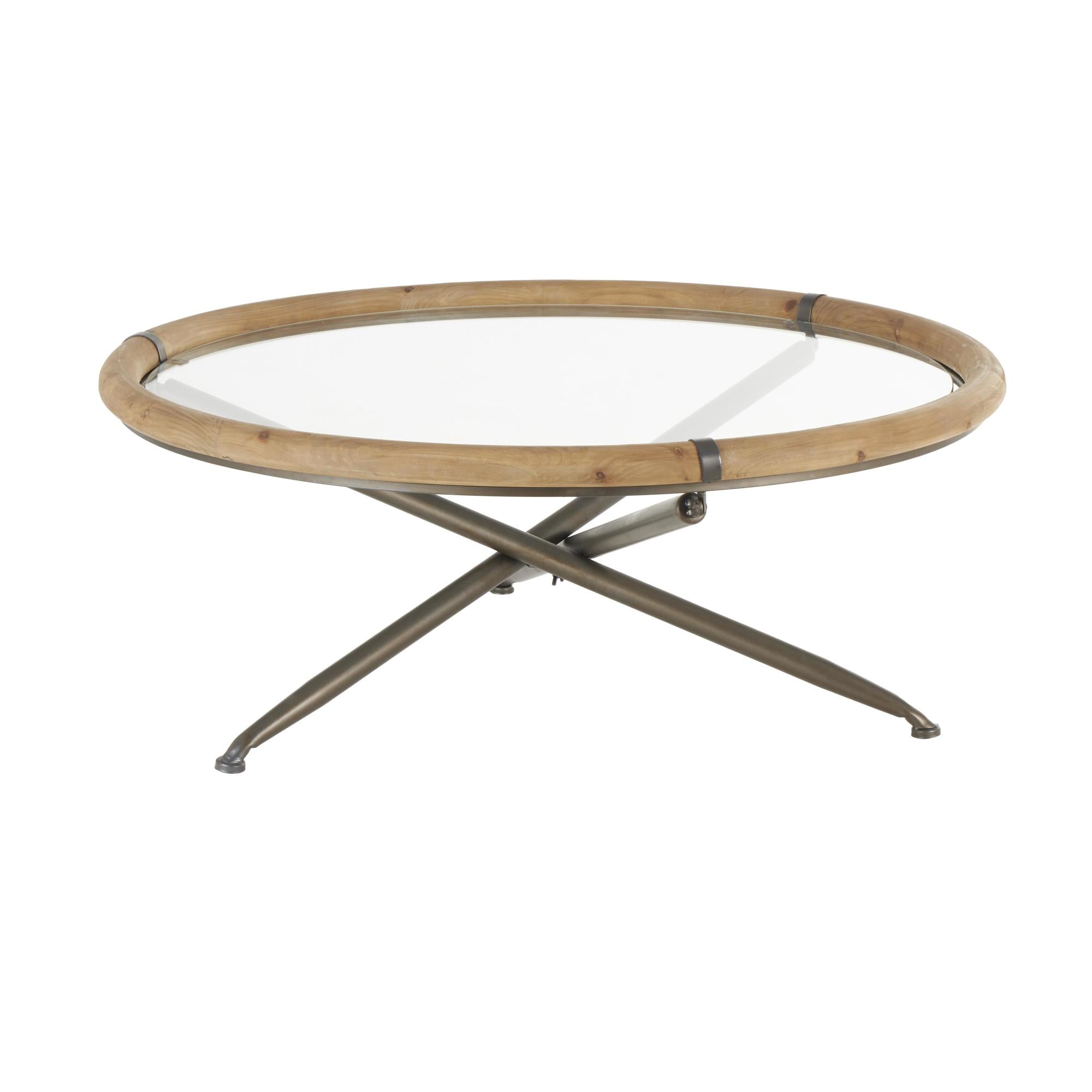•This iron living room table features a wooden framed glass tabletop for added sophistication