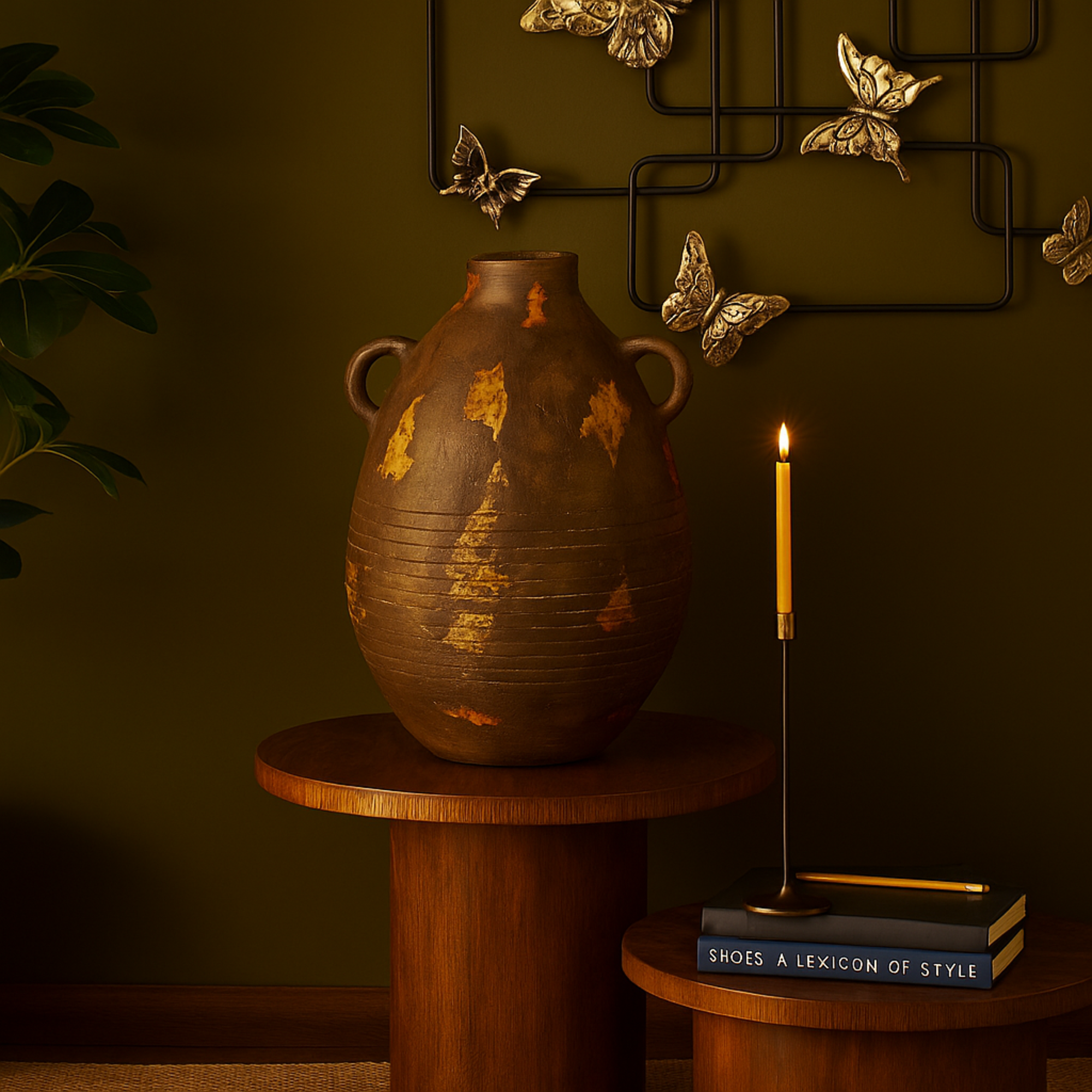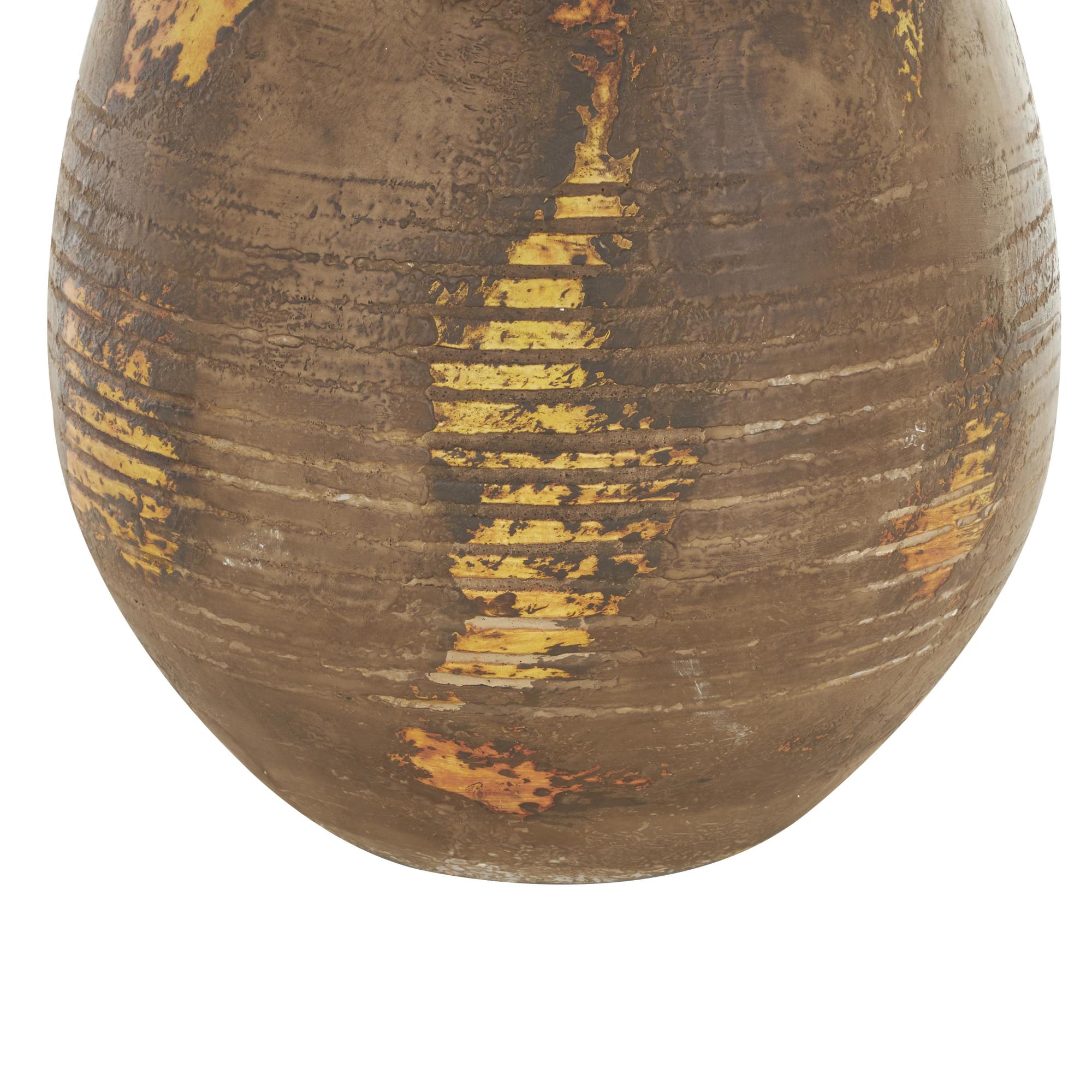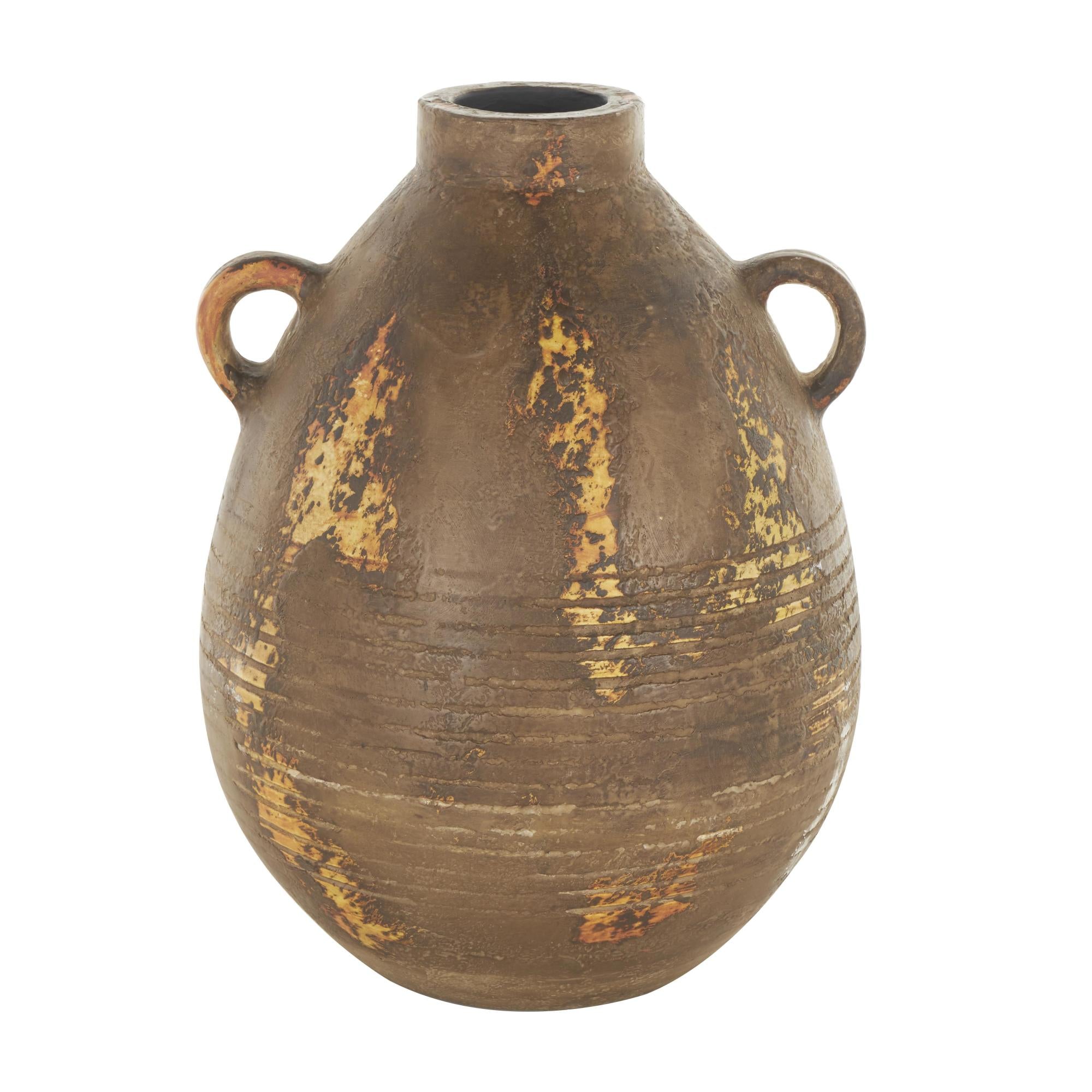 Brown Ceramic Antique Style Distressed Decorative Vase with Grooves and Handles