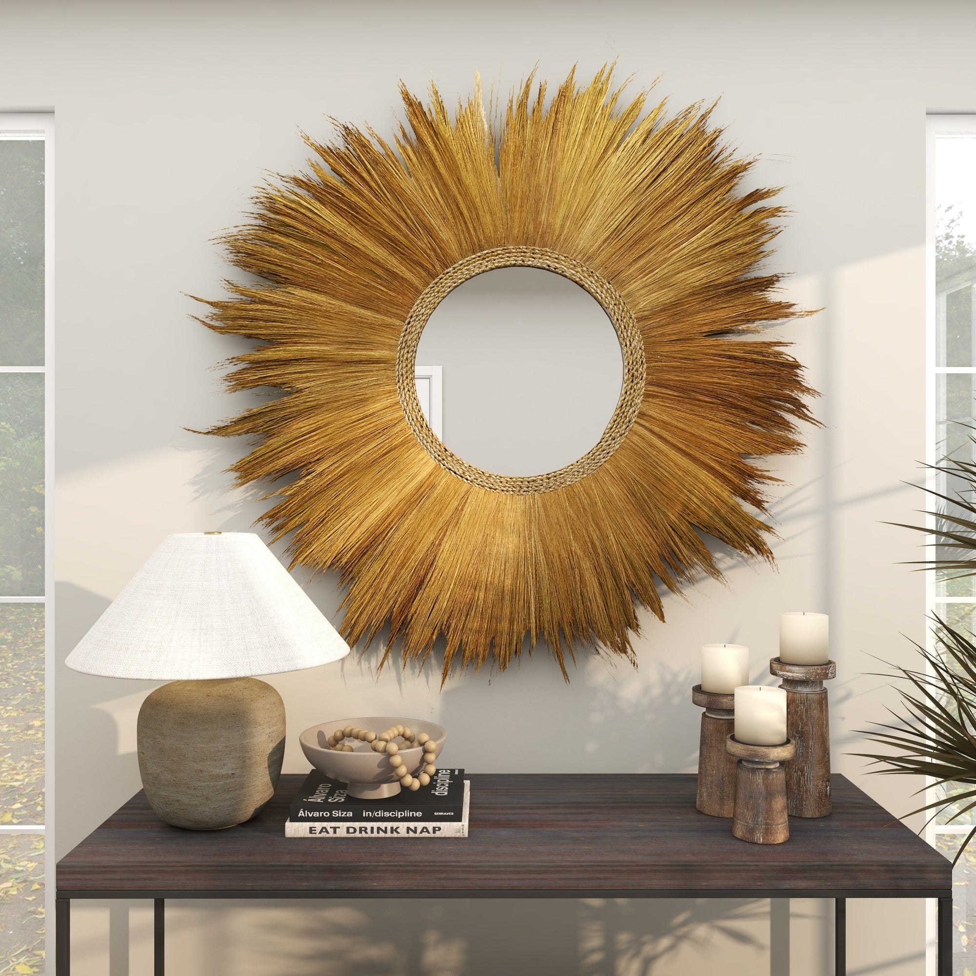 Brown Dried Plant Tribal Inspired Sunburst Grass Room Wall Mirror with Coiled Rope Center