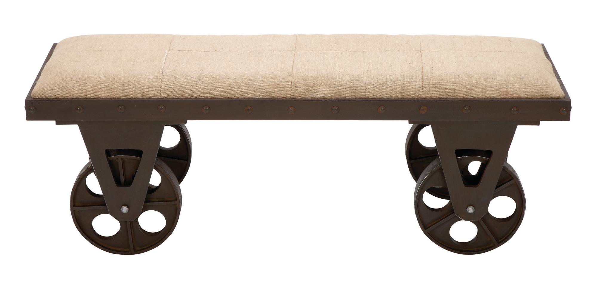 Brown Linen Fabric Vintage Industrial Inspired Home Bench with Wheels and Linen Upholstered Seat