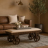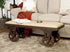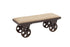 •This wood bench features a wagon-style structure with four round wheels and bolted detailing around the plush upholstered seat