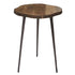 •This mango wood accent table features unique elements like a slice of tree trunk tabletop paired with tapered metal tripod legs, adding to its rustic charm