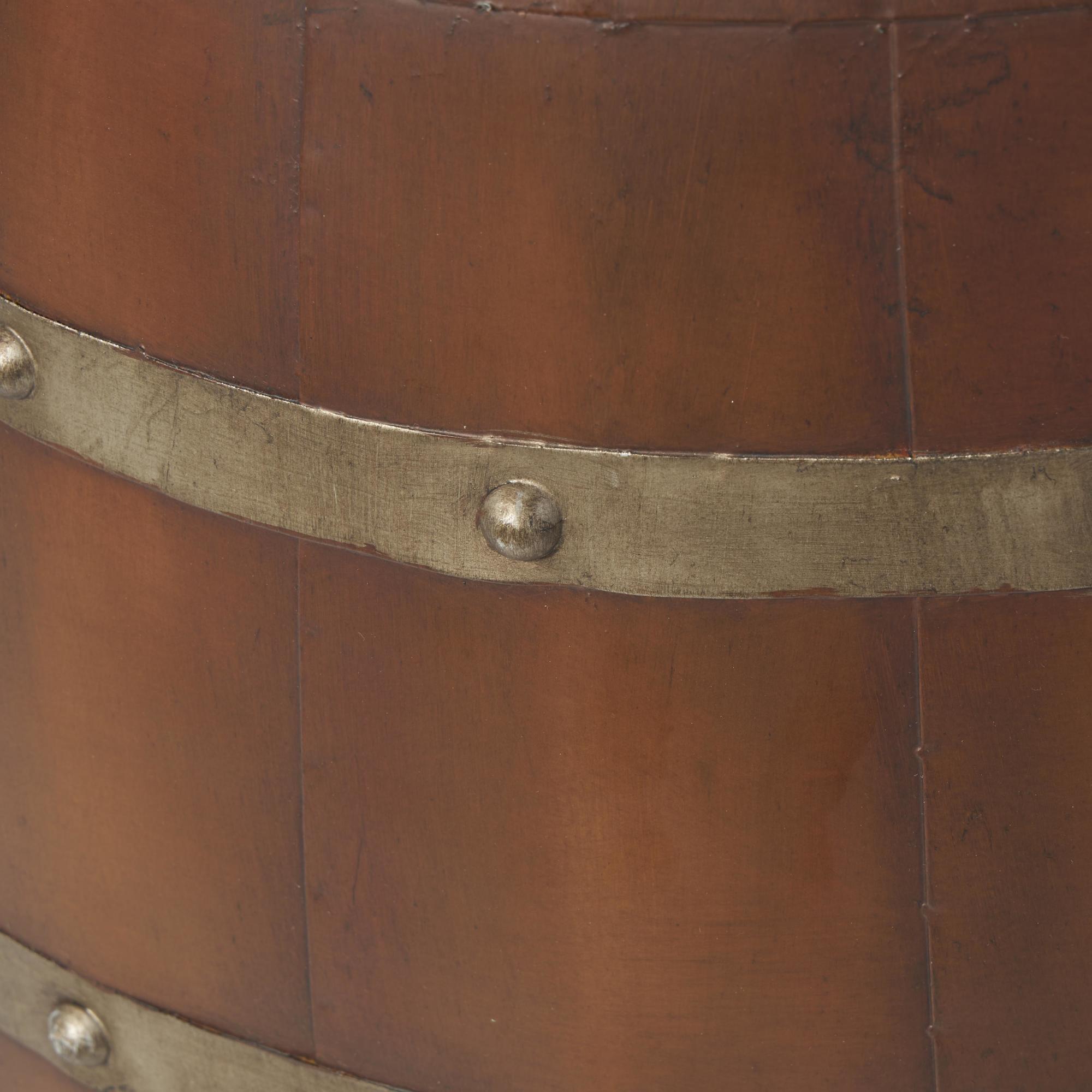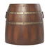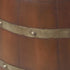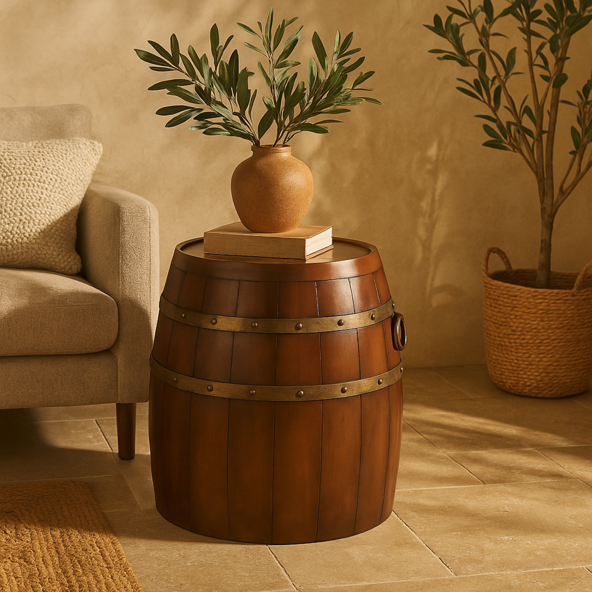 •Boasting a unique barrel shape design with rivets, braces, and handles, this oiled living room table stands as a testament to innovative design and function