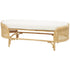 •This natural bench for entryway features woven rattan pieces along the sides, securely attached to thick rattan poles that form the base, and a fabric cushion placed on the MDF seat