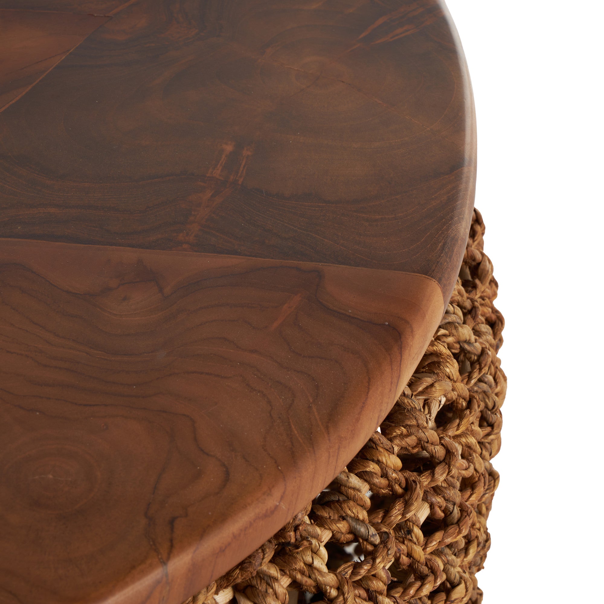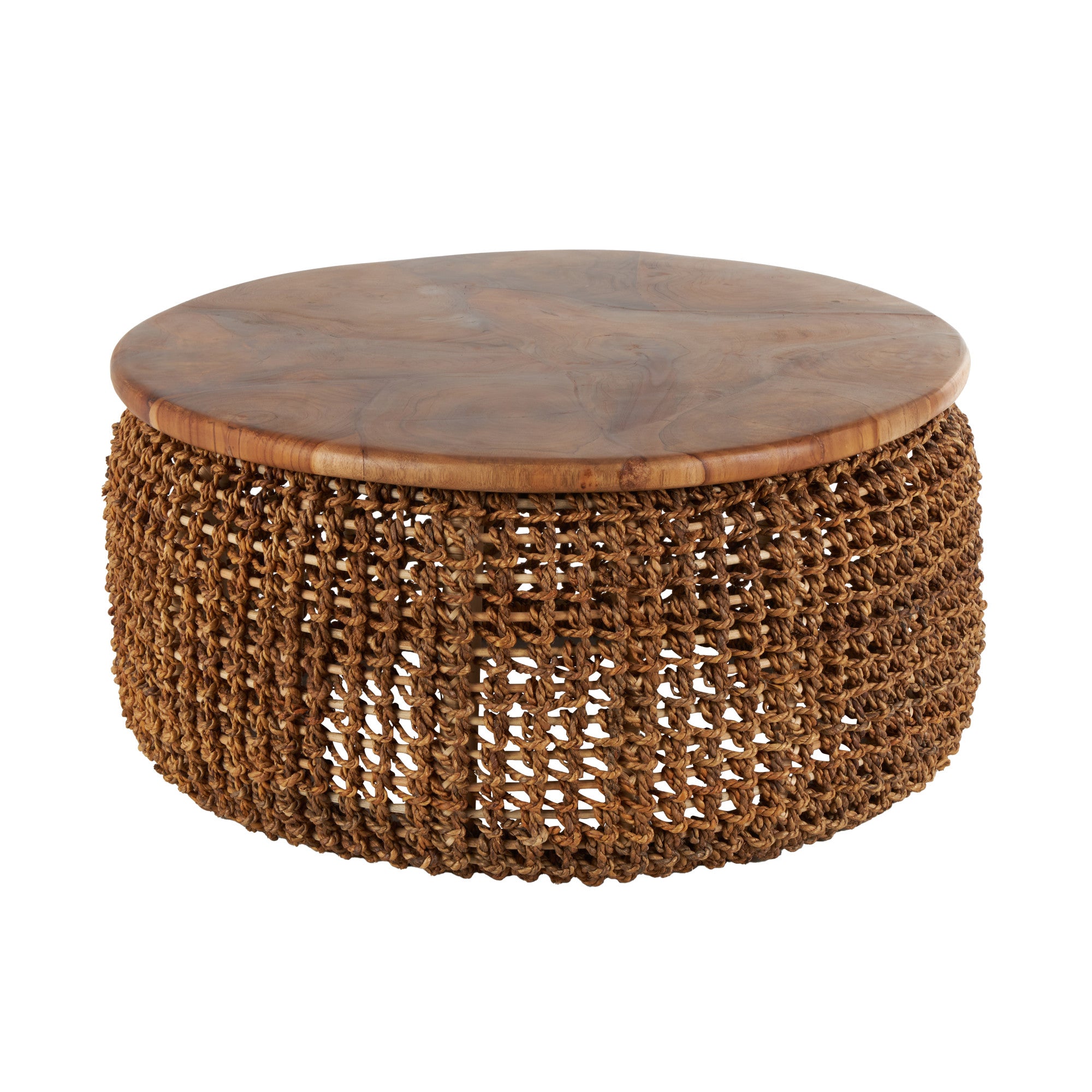 Brown Rattan Woven Living Room Coffee Table with Teak Tabletop