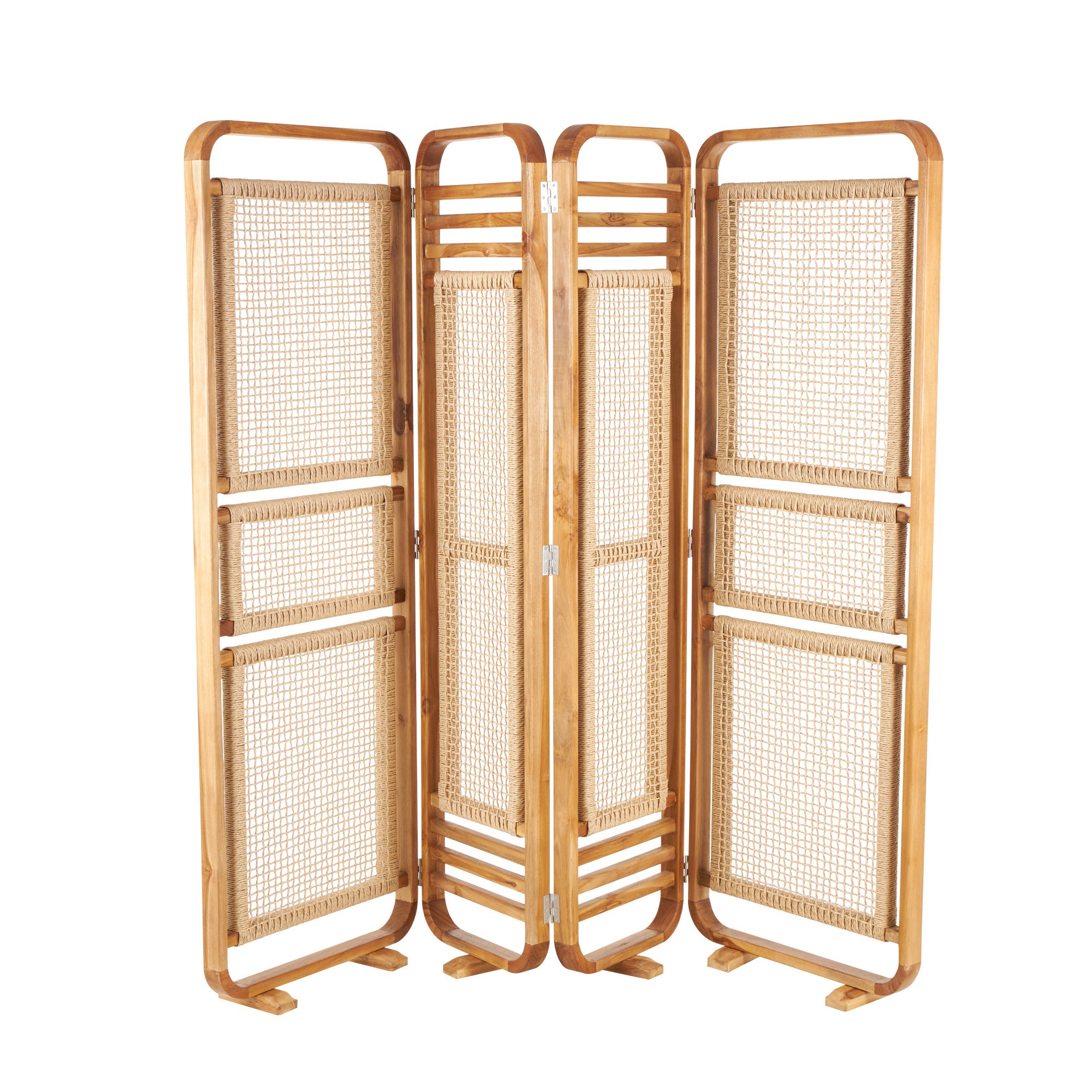 Brown Teak Wood Handmade Foldable Partition 4 Panel Partition Room Divider Screen with Woven Rattan Panels