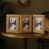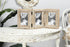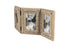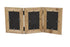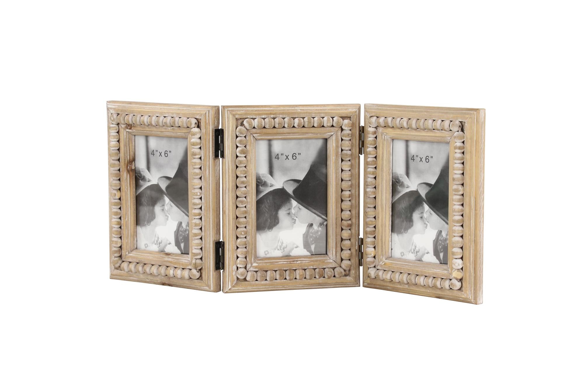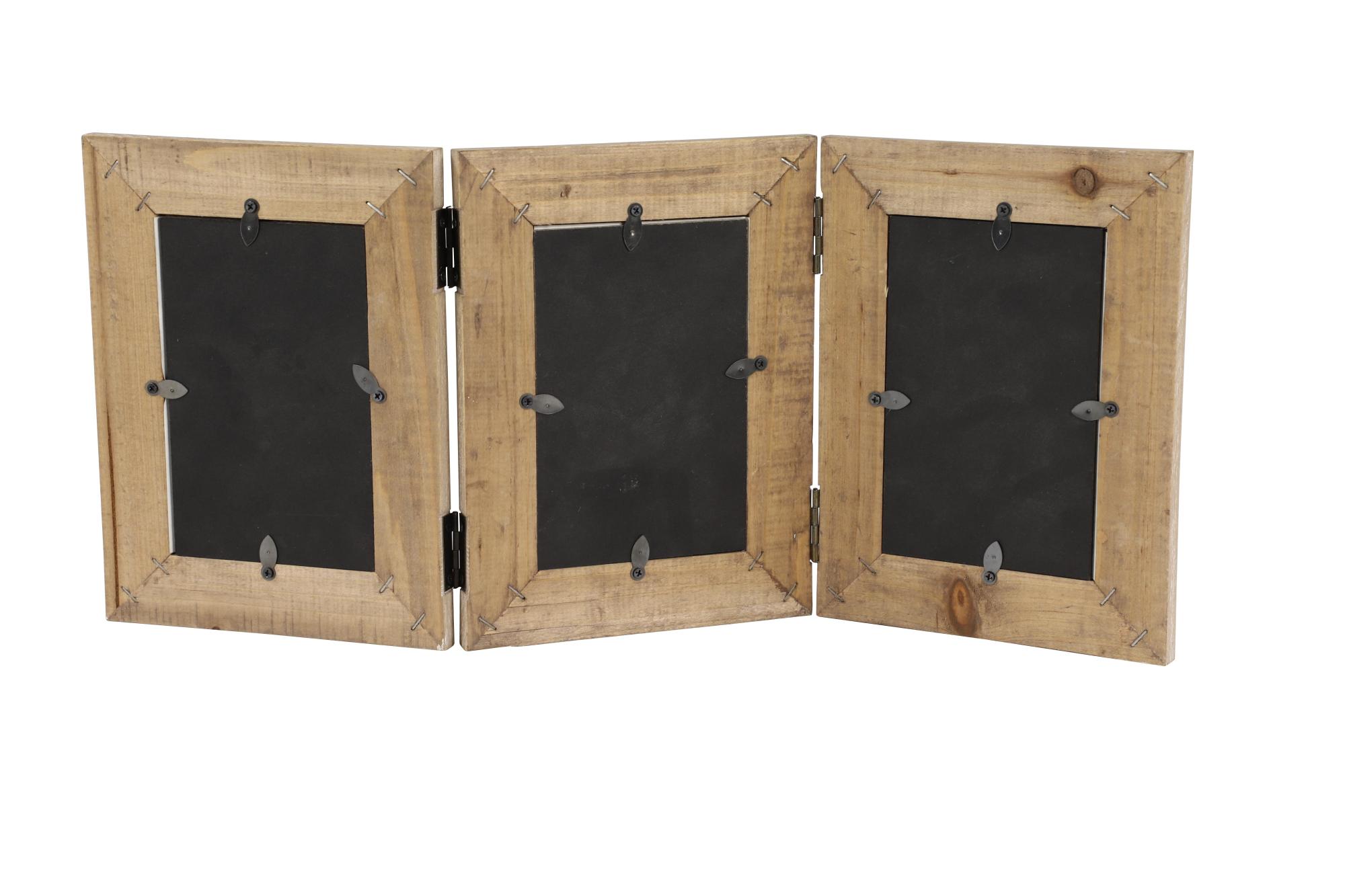 •This fir photo frame includes metal hinges securing three frames, each holding a 4" x 6" print protected by glass