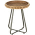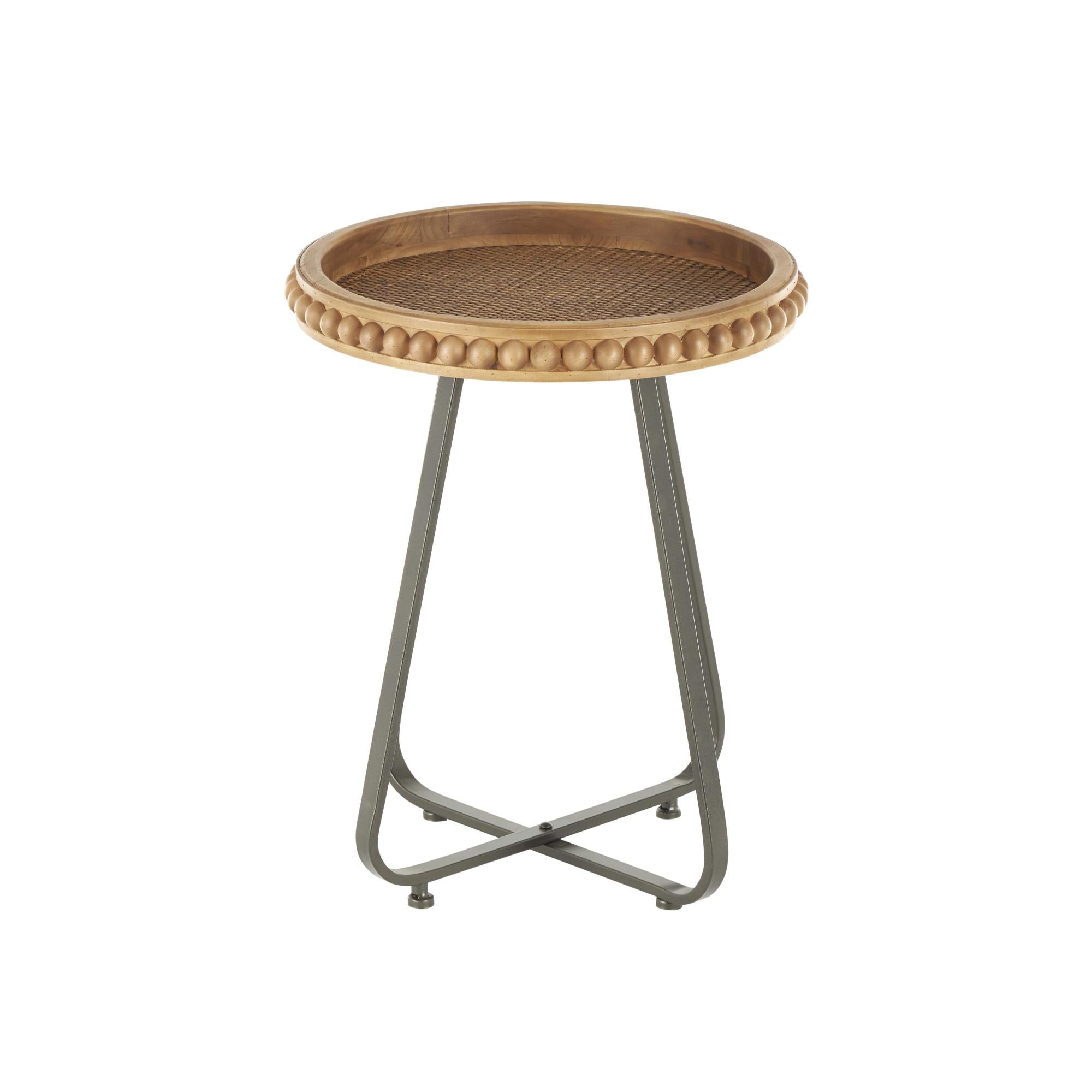 Brown Wood Beaded Side End Accent Table with Rounded Gray Metal Base and Rattan Accent