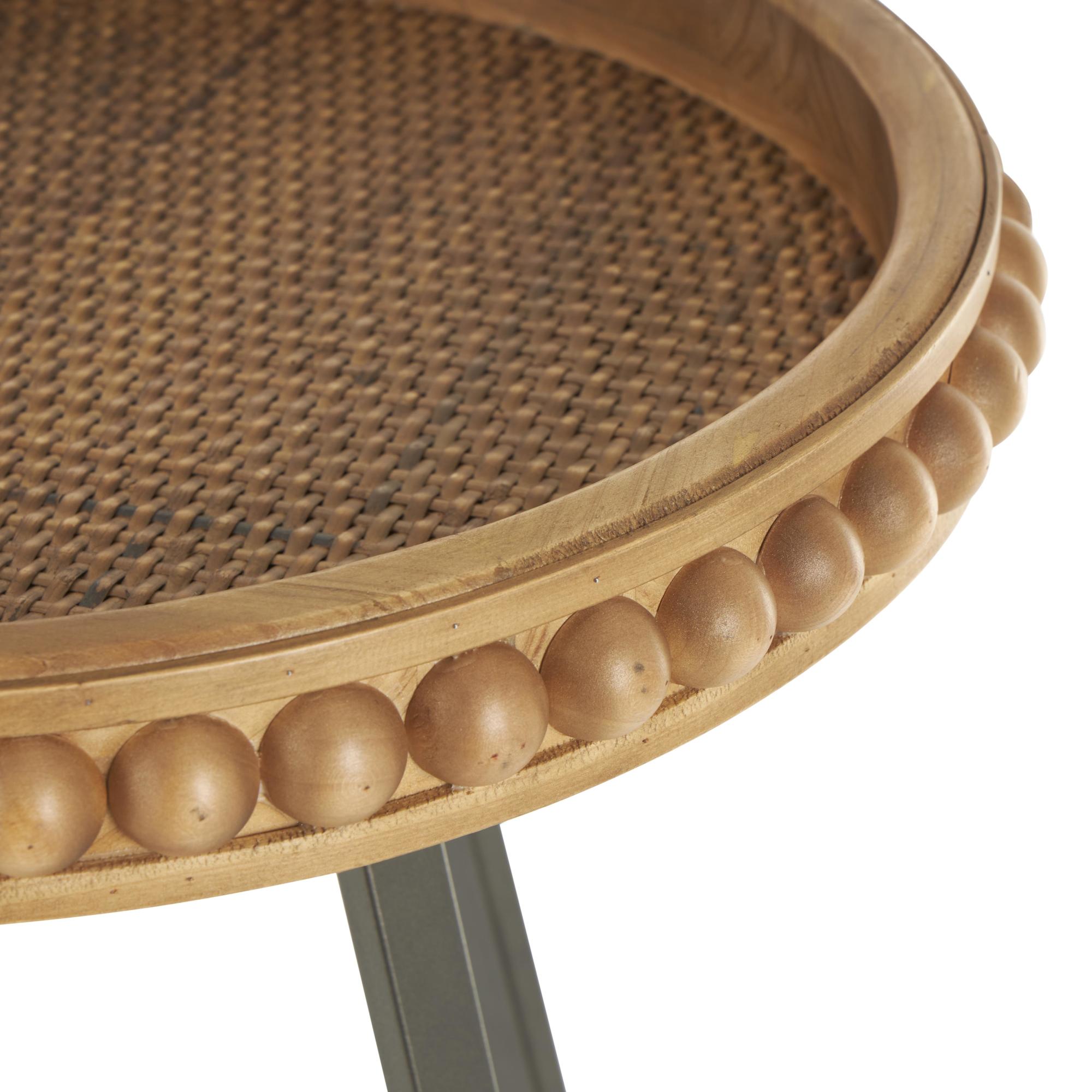 •This wooden accent table stands out with its beaded detailing on the tabletop and the rattan accent on the base, adding a touch of bohemian charm to any room